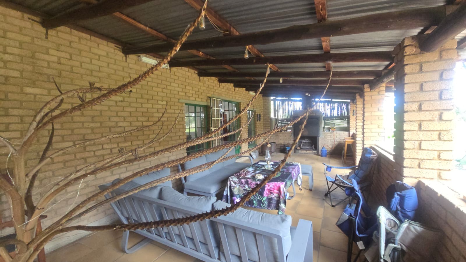 A welcoming entrance leads to a generous patio with a built-in braai — ideal for relaxed entertaining while enjoying the natural surroundings.