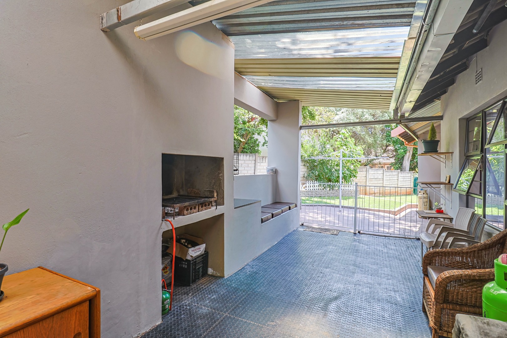 Covered patio with built-in braai overlooking the pool...