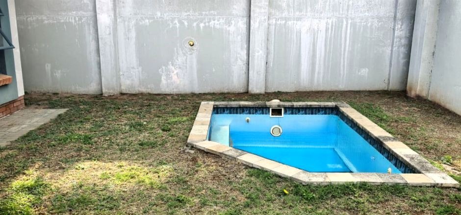 Low-maintenance garden with a sparkling swimming pool, offering the ideal outdoor lifestyle.