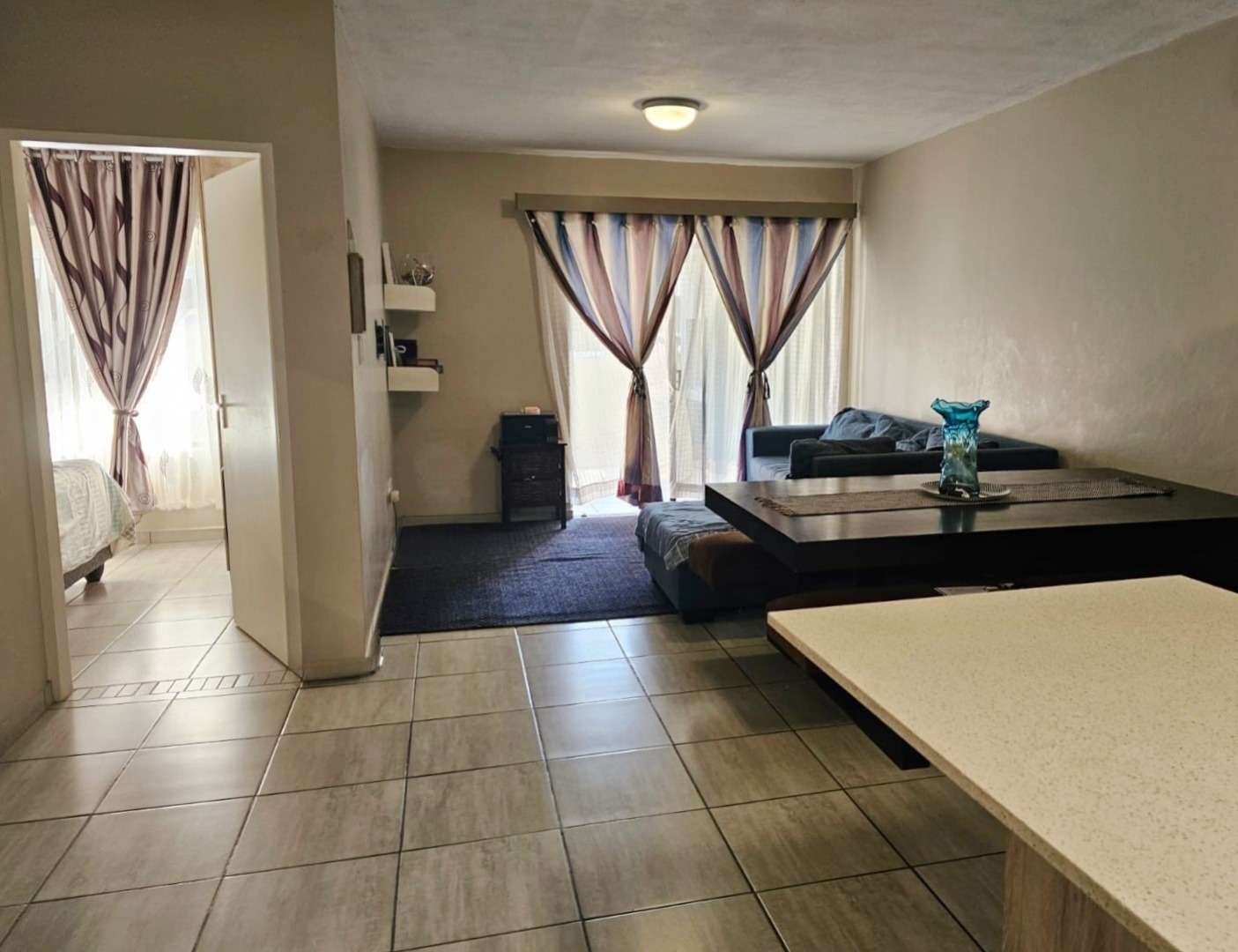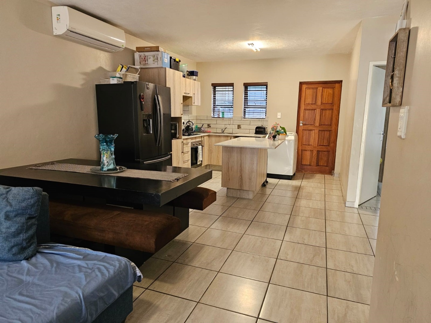 Discover modern living in this inviting 3-bedroom, 2-bathroom rental property located within a secure estate in Waterkloof East, Rustenburg. Spanning 90 square meters, this residence offers a comfortable and functional layout designed for contemporary lifestyles. The heart of the home features an open-plan living area, seamlessly connecting the lounge, dining space, and a modern kitchen. Tiled flooring throughout ensures durability and easy maintenance, while large windows allow ample natural light to brighten the interiors. The well-appointed kitchen boasts light wood cabinetry, a practical breakfast bar/island, and space for essential appliances, making it ideal for both everyday meals and entertaining. An air conditioning unit in the main living area provides comfort during warmer months. Each of the three bedrooms offers a private retreat, with the main bedroom benefiting from an en-suite bathroom. The bathrooms feature modern fixtures, including a stylish vessel sink and walk-in showers with contemporary tiling, providing a fresh and clean aesthetic. Step outside to a private tiled patio, complete with a built-in braai, perfect for outdoor entertaining and enjoying the South African climate. Sliding glass doors connect the indoor living space to this outdoor amenity, enhancing the flow of the home. The property includes one dedicated parking bay, adding to the convenience. Situated within a security estate, residents benefit from a gated community with an access gate, guardhouse, boom barrier, and electric fencing, ensuring peace of mind. Burglar bars further enhance the property's security profile. This unfurnished home is ideal for professionals or small families seeking a secure, lock-up-and-go lifestyle in a well-regarded Rustenburg suburb. Key Features: * 3 Bedrooms, 2 Bathrooms (1 En-suite) * 90 sqm Floor Size * Open-plan Living, Dining & Kitchen * Modern Kitchen with Breakfast Bar * Private Tiled Patio with Built-in Braai * Air Conditioning * Secure Gated Estate with Electric Fencing * 1 Parking Bay * Tiled Flooring Throughout