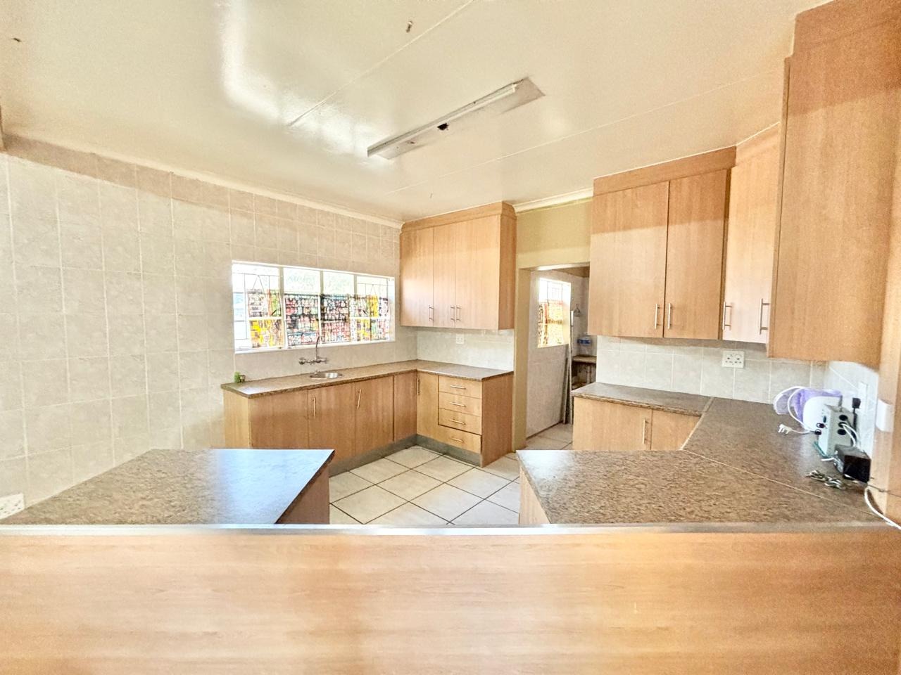 The spacious U-shaped kitchen is equipped with extensive light wood-grain cabinetry, speckled countertops, and tiled floors, offering ample storage and natural light. While some areas exhibit dated finishes, this presents an excellent opportunity for renovation. The home comprises three comfortable bedrooms, including one with an ensuite bathroom, plus an additional full bathroom and a guest toilet. Bedrooms feature tiled flooring and practical built-in cupboards.