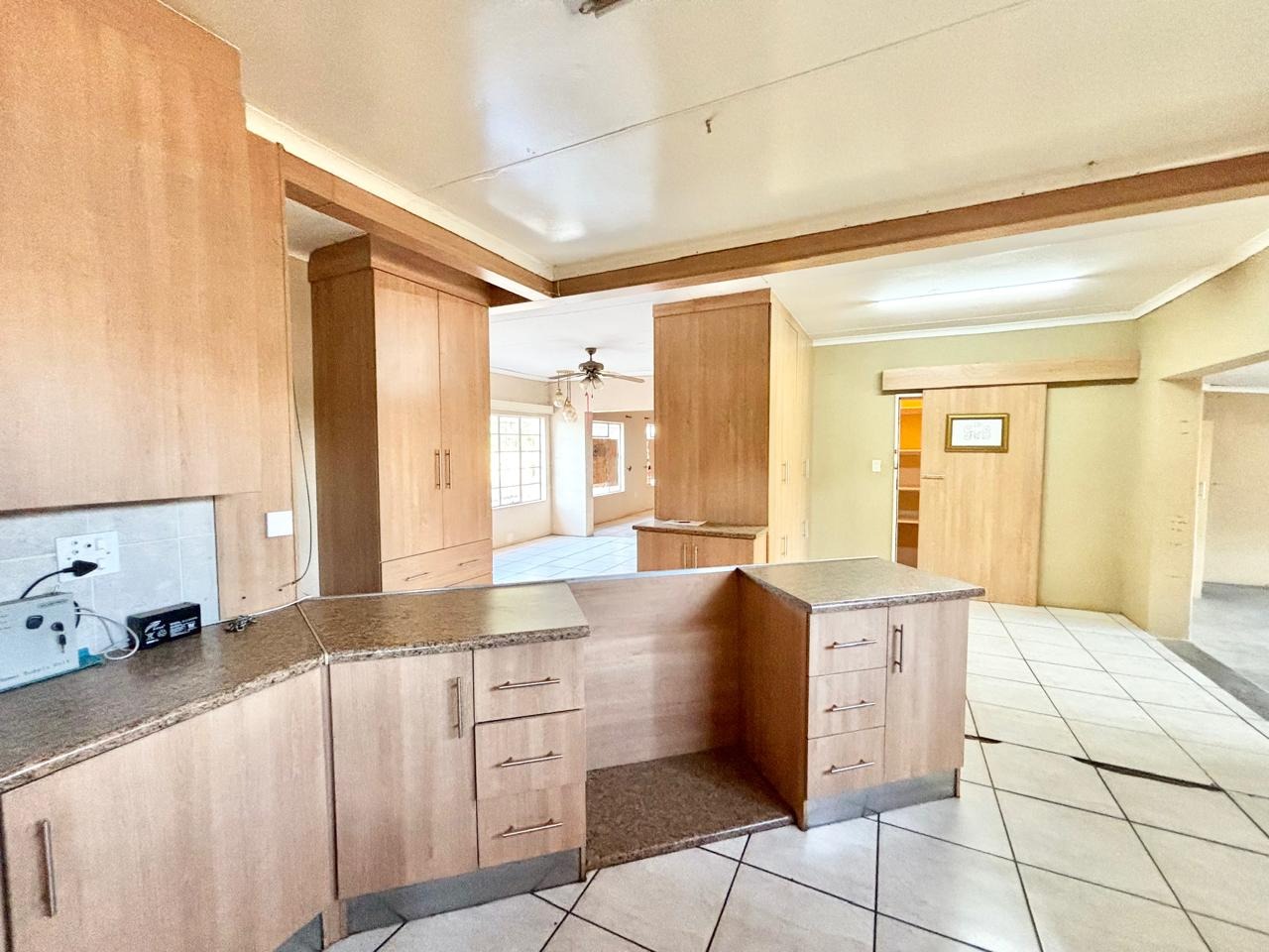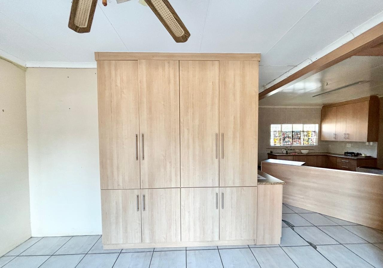 Situated in a suburban setting, this property offers a tranquil lifestyle with significant potential for investment and customisation, offering a substantial 1500 sqm erf and a generous 253 sqm floor size. The property boasts a freshly painted light grey exterior, a dark tiled roof, and a large front lawn, creating a welcoming first impression. Enhanced security features, including window bars and an access gate, provide peace of mind. Inside, an open-plan design connects the lounge, dining room, and family TV room, setting the stage for comfortable living.