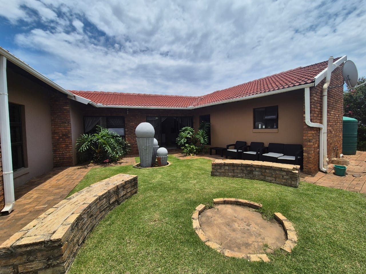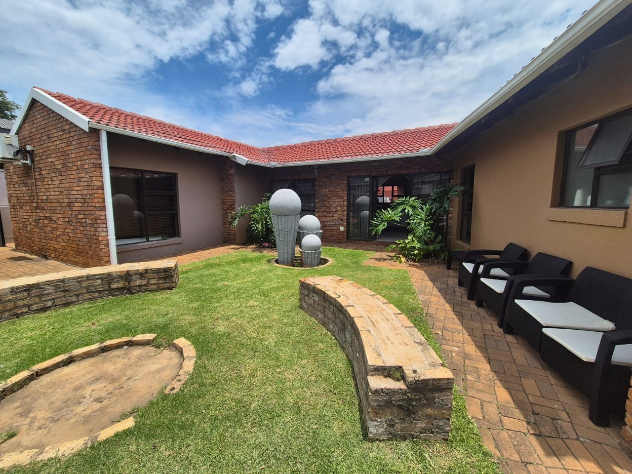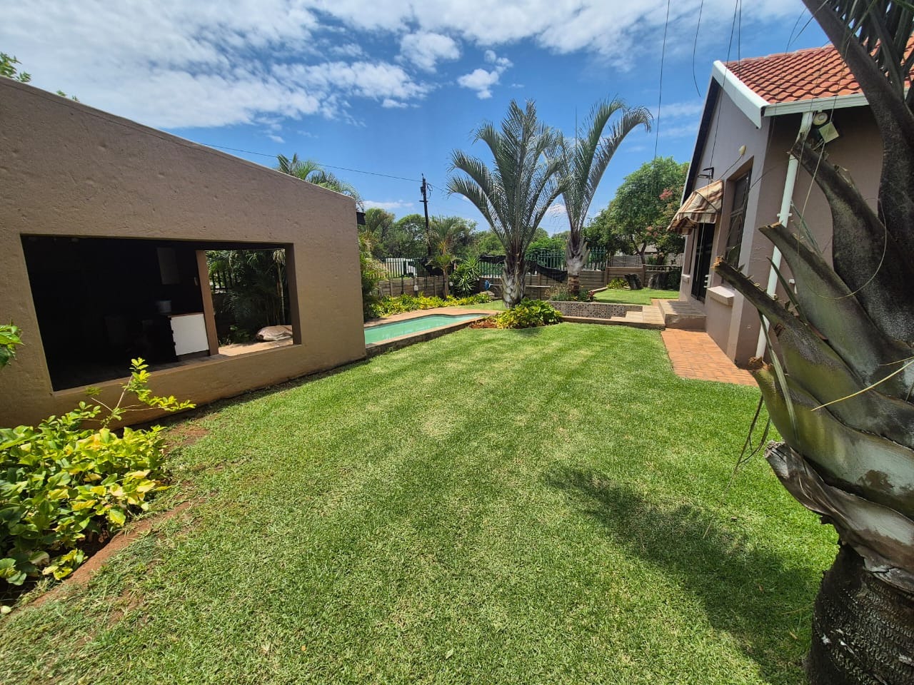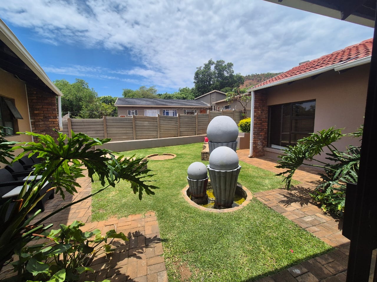 The beautifully landscaped garden is enhanced by tranquil water features and supported by a JoJo tank, borehole, and irrigation system, ensuring lush greenery throughout the year.