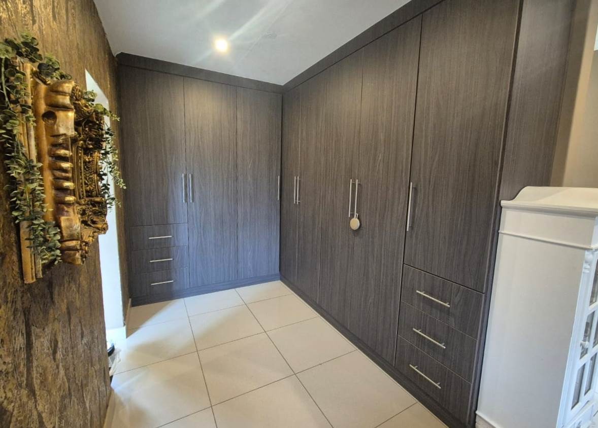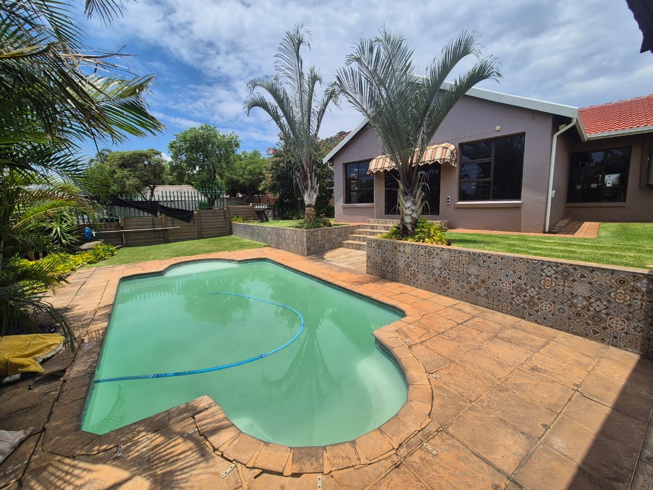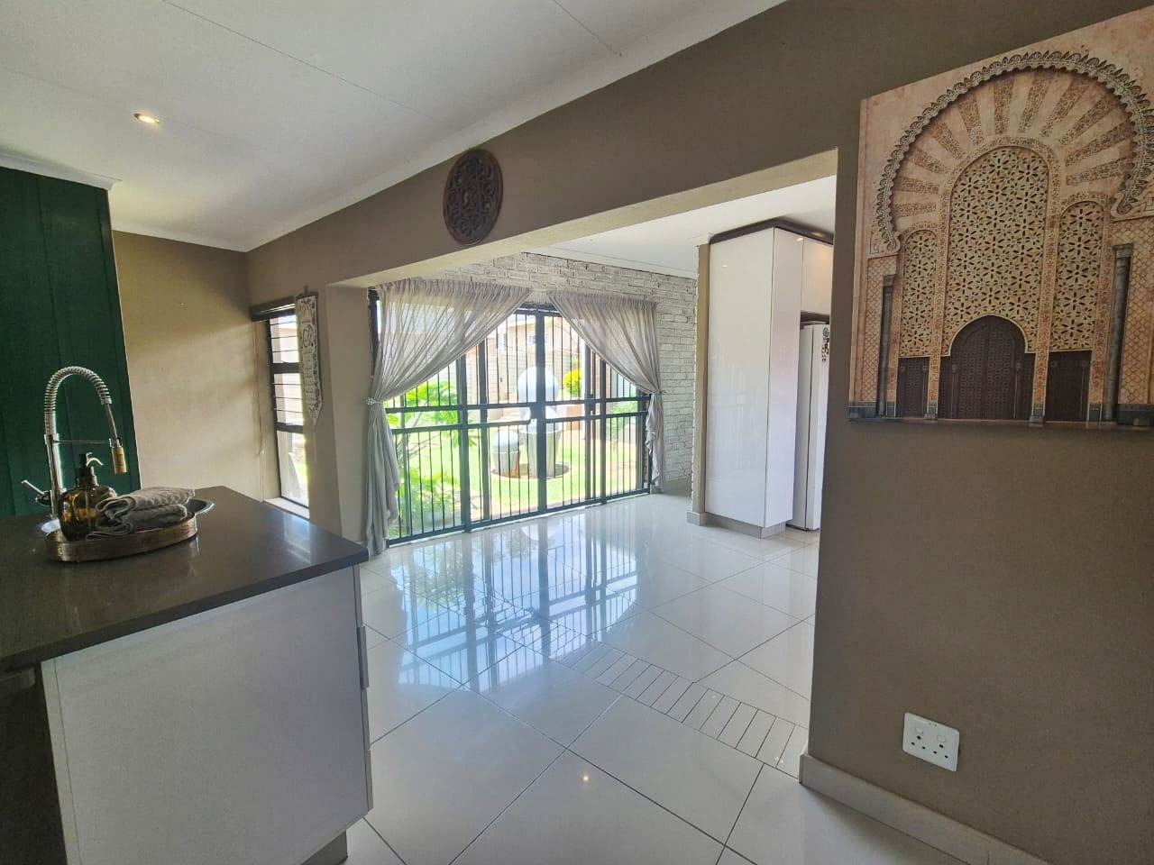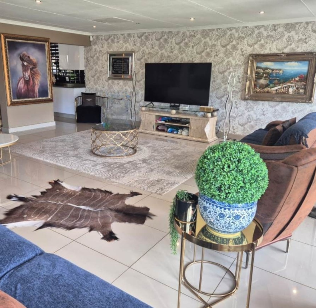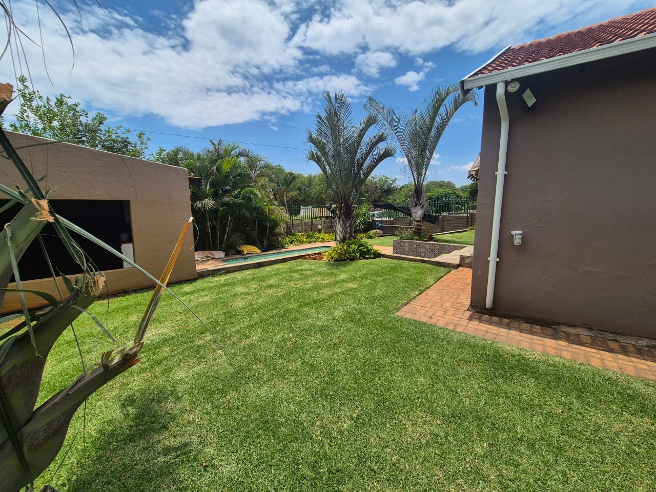 The beautifully landscaped garden is enhanced by tranquil water features and supported by a JoJo tank, borehole, and irrigation system, ensuring lush greenery throughout the year.