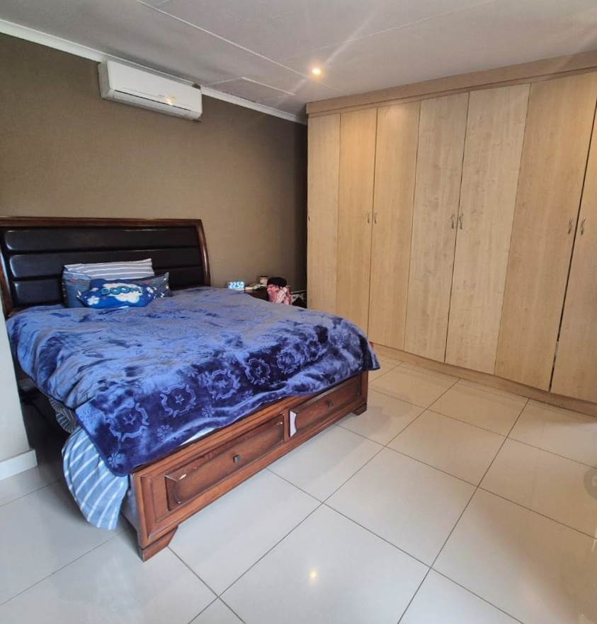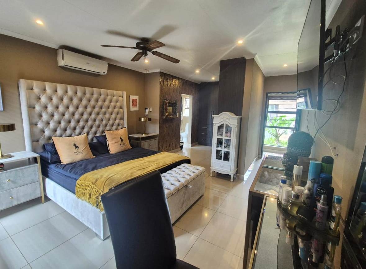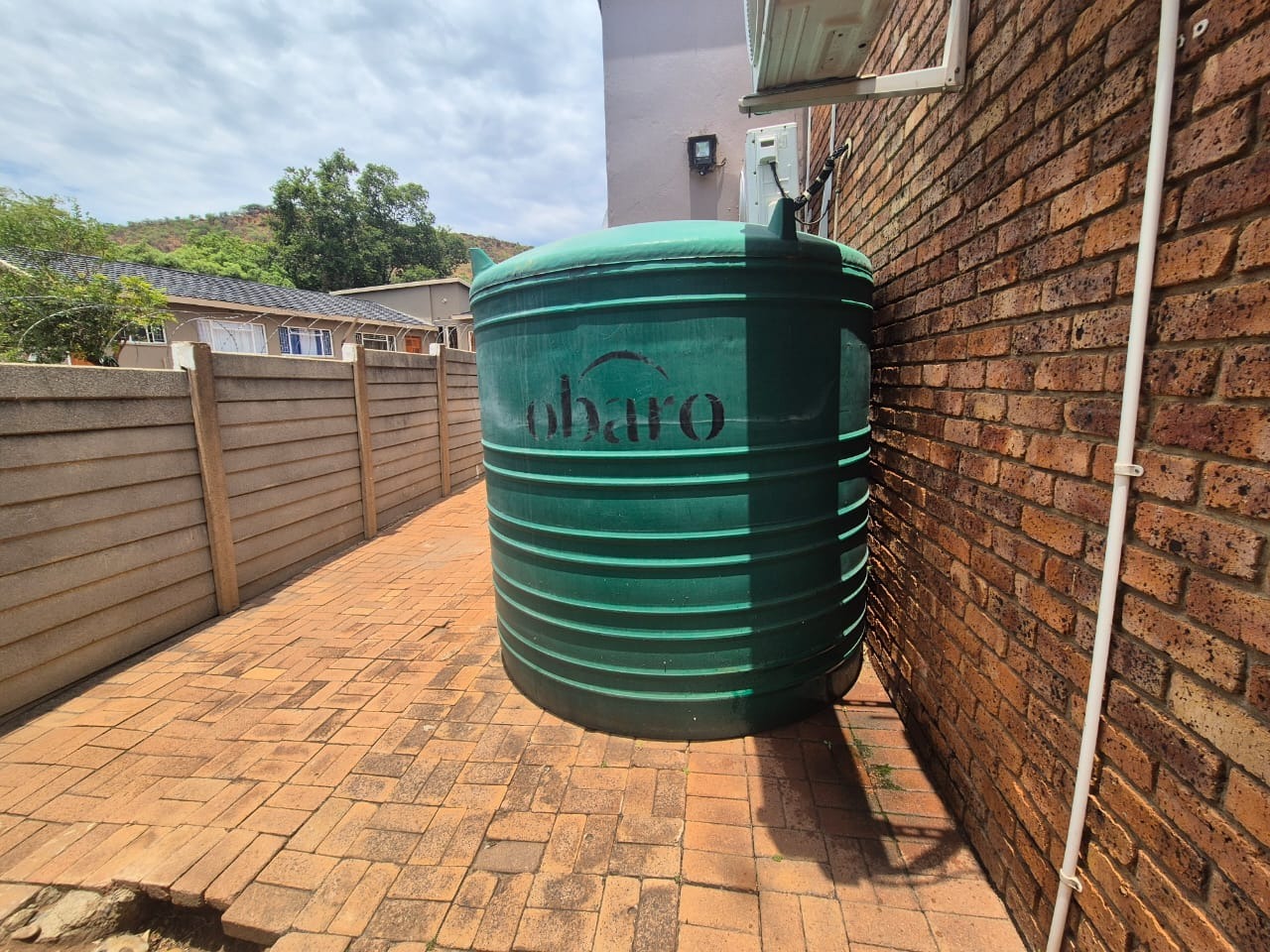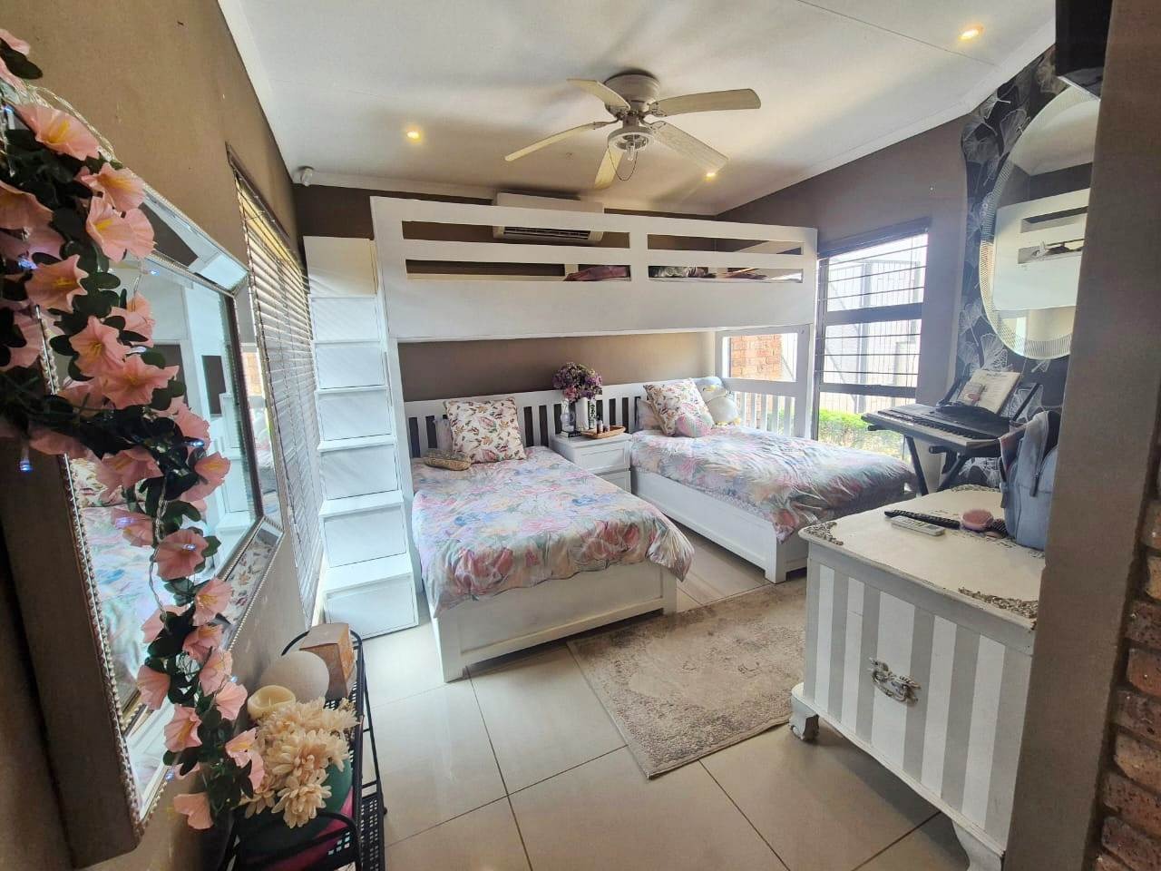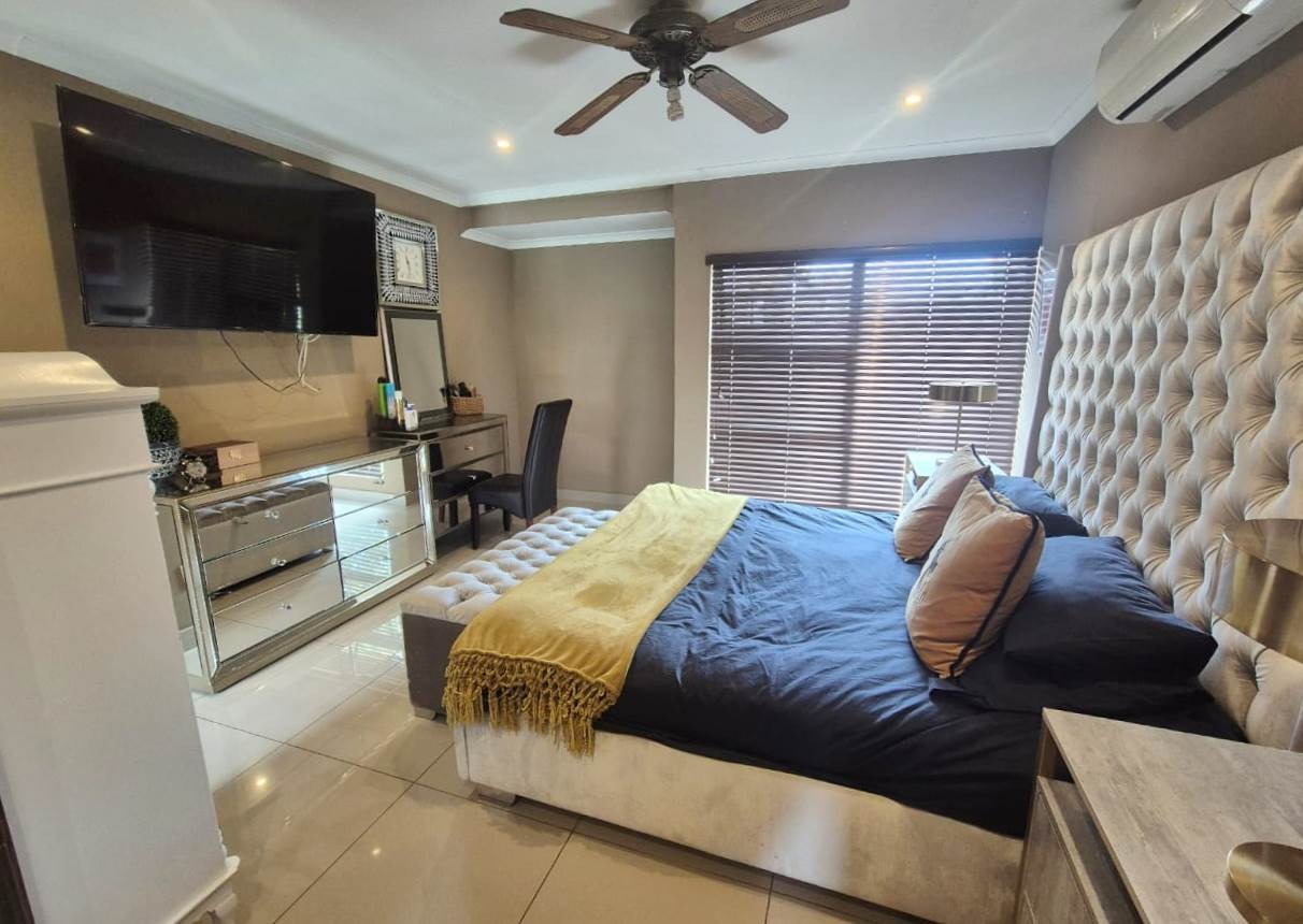 The beautifully landscaped garden is enhanced by tranquil water features and supported by a JoJo tank, borehole, and irrigation system, ensuring lush greenery throughout the year.