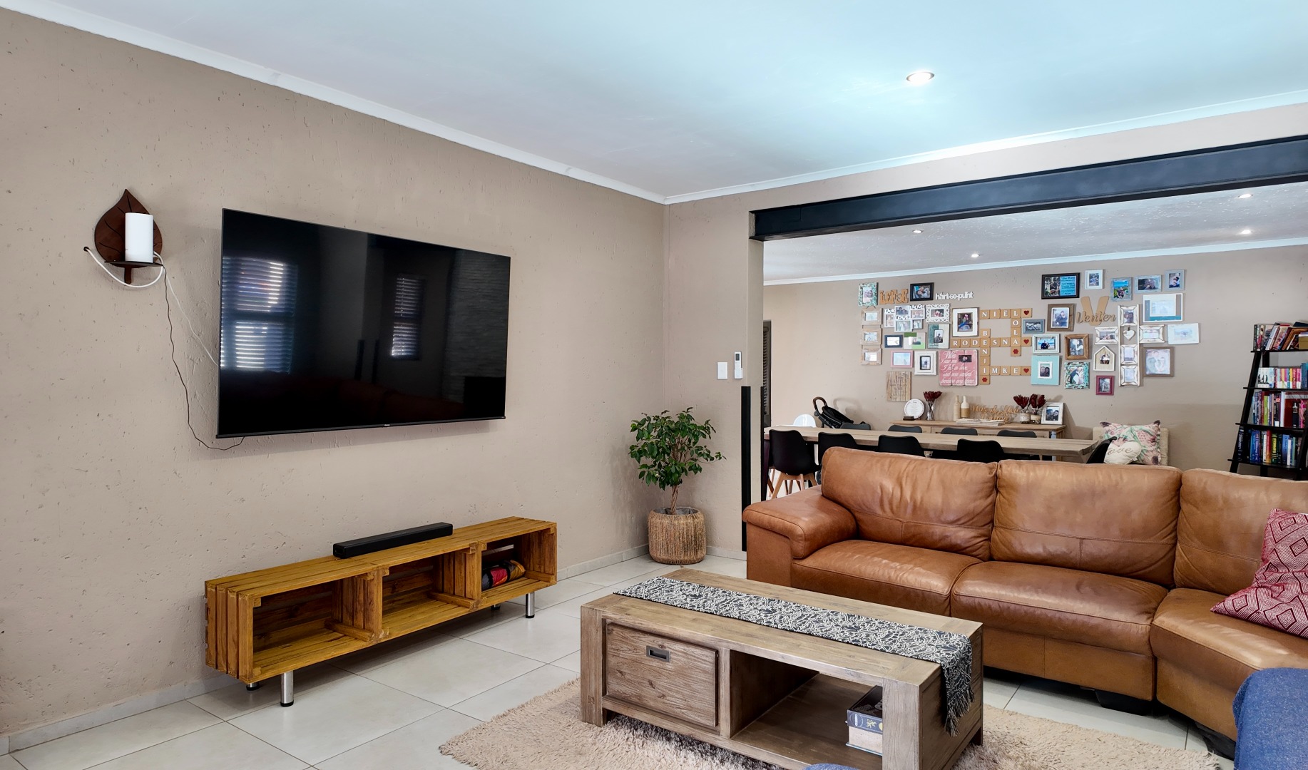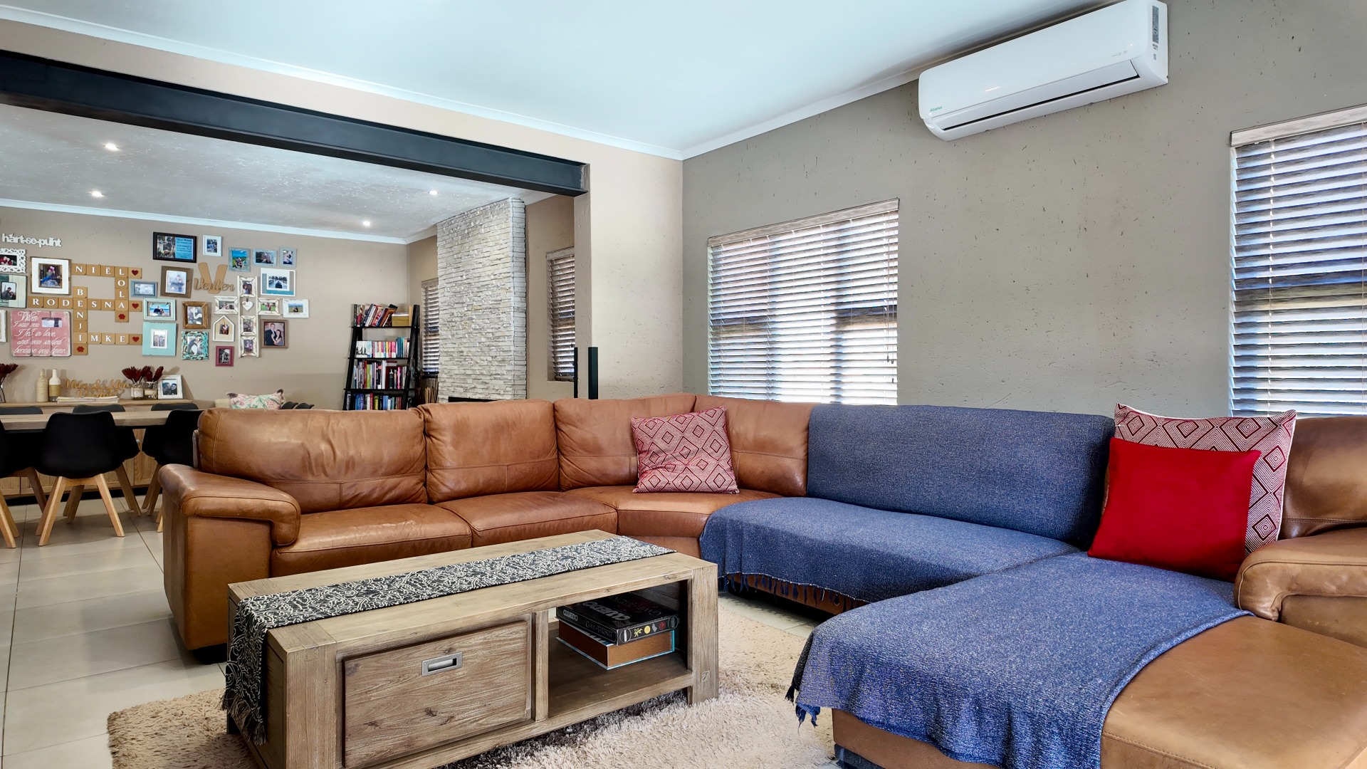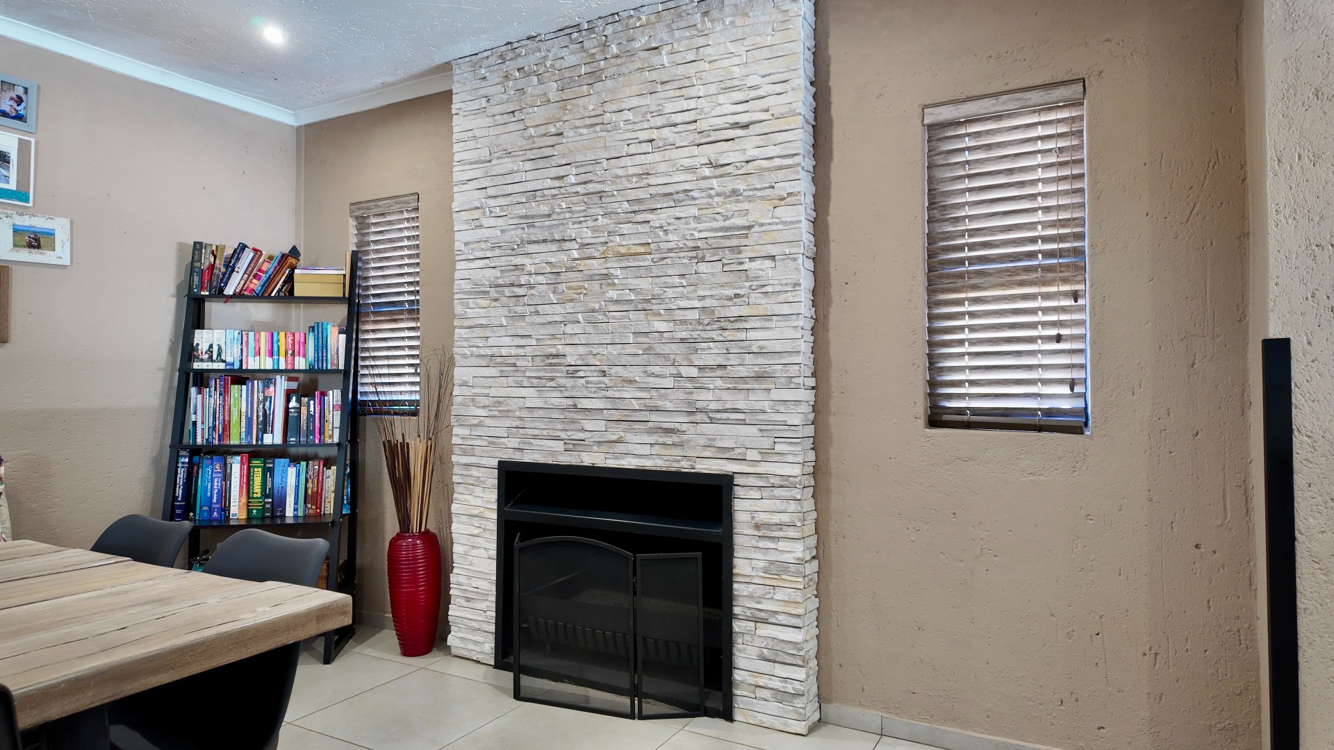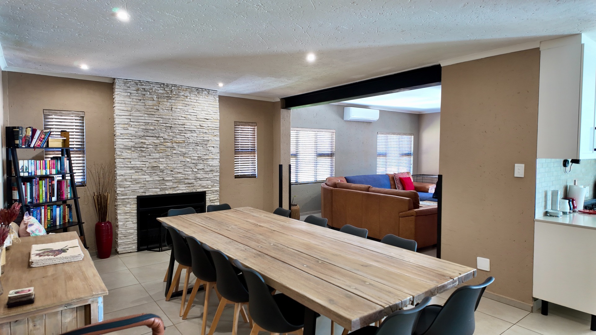 • Open-plan L-shaped lounge and dining area (fitted fireplace) leading to a covered patio with a built-in braai – perfect for entertaining.