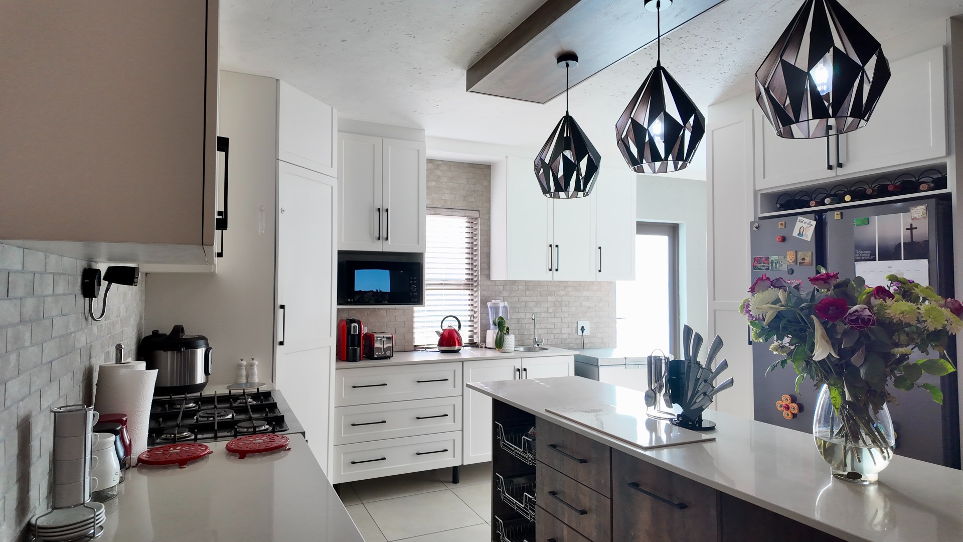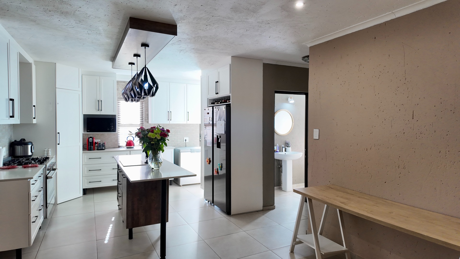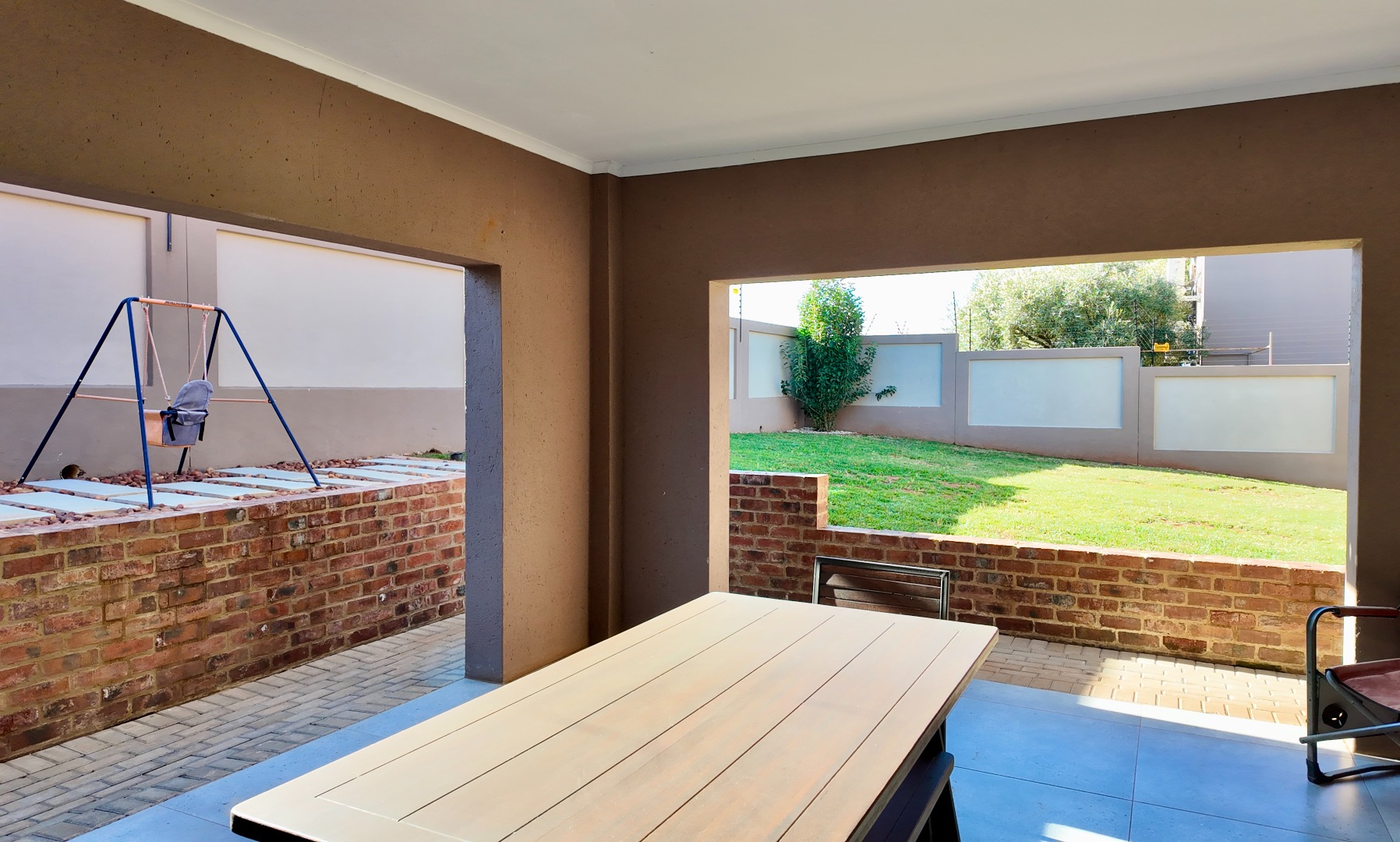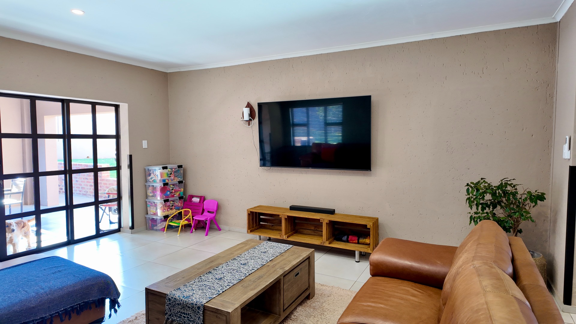 • Open-plan L-shaped lounge and dining area (fitted fireplace) leading to a covered patio with a built-in braai – perfect for entertaining.
