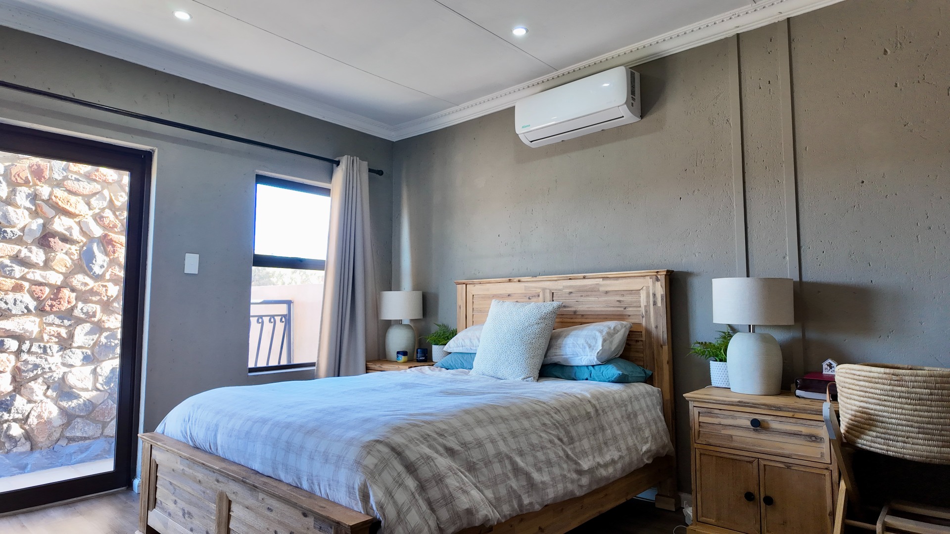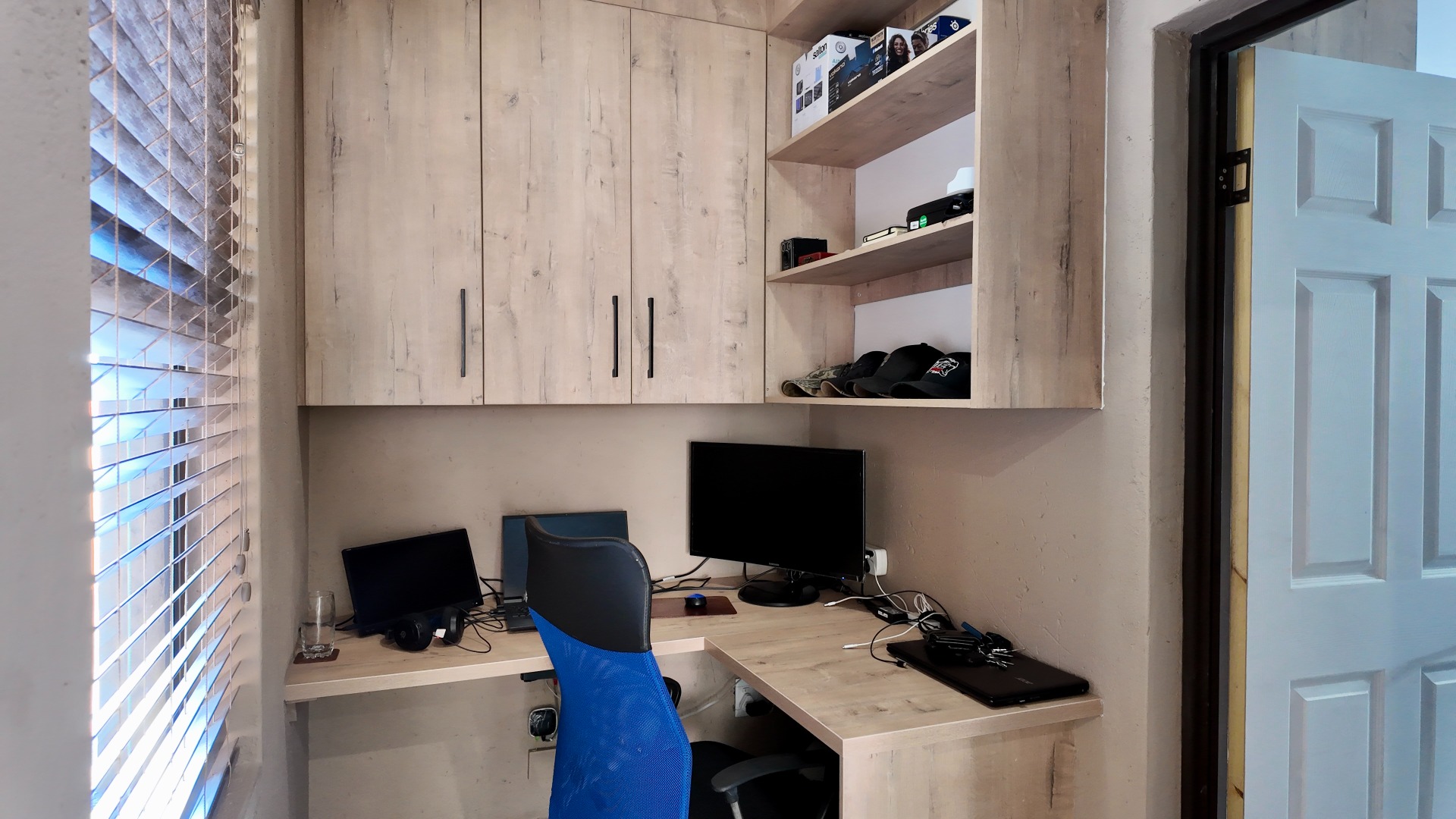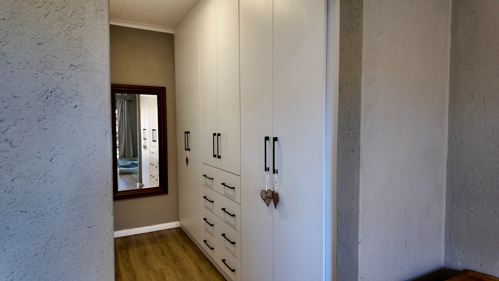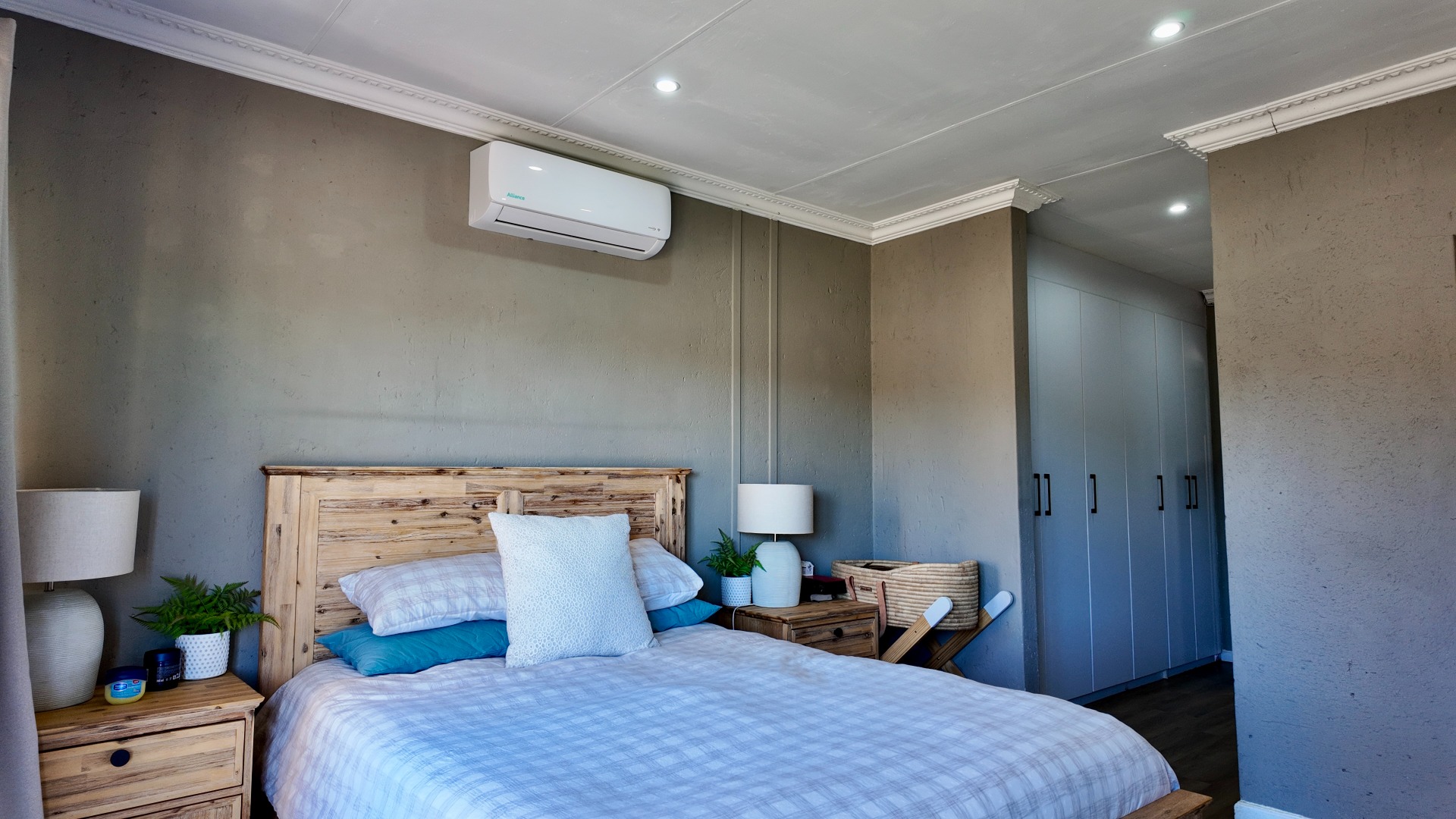• Open-plan L-shaped lounge and dining area (fitted fireplace) leading to a covered patio with a built-in braai – perfect for entertaining.