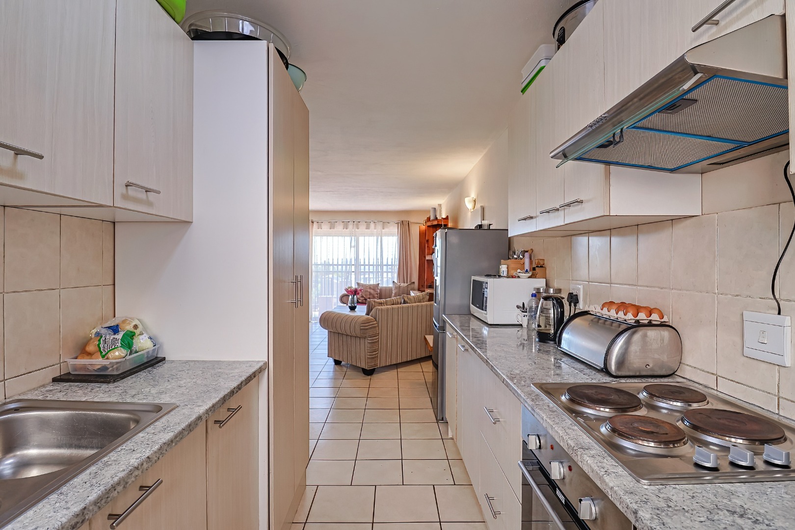 The kitchen is neat and practical, featuring ample cupboard space, a built-in oven and hob, and enough room for all your daily essentials.