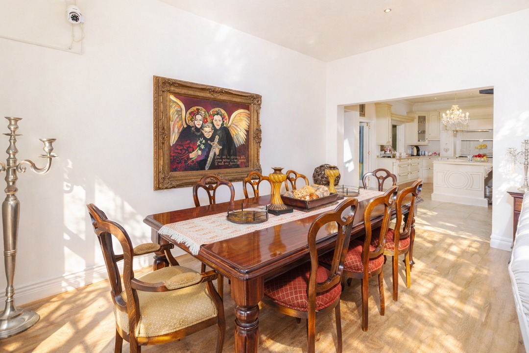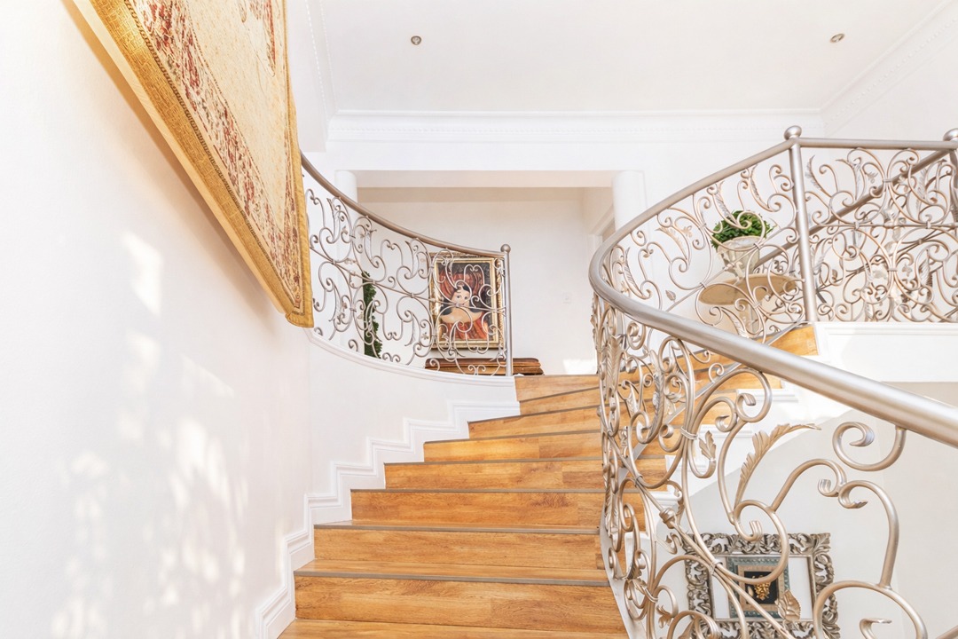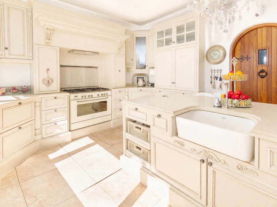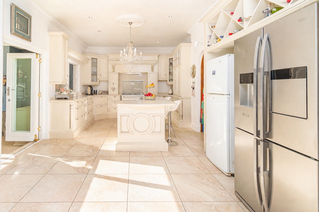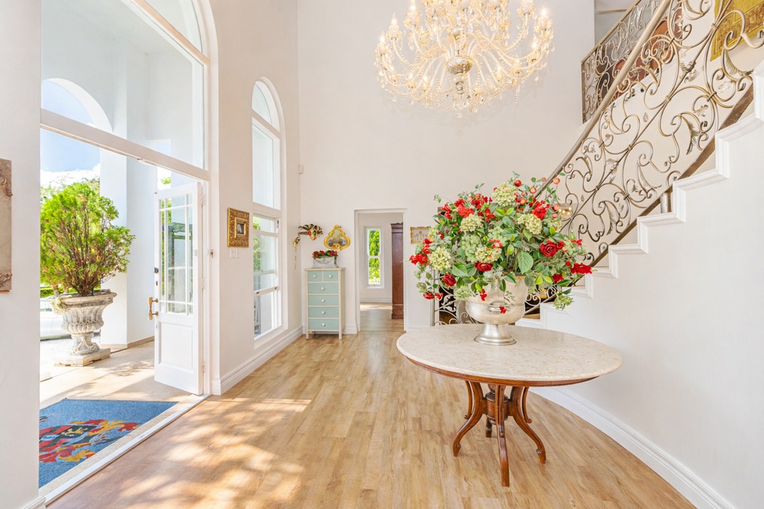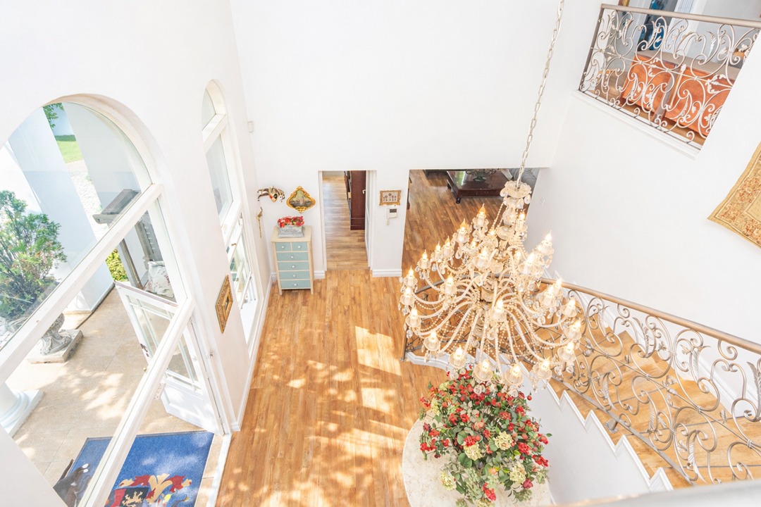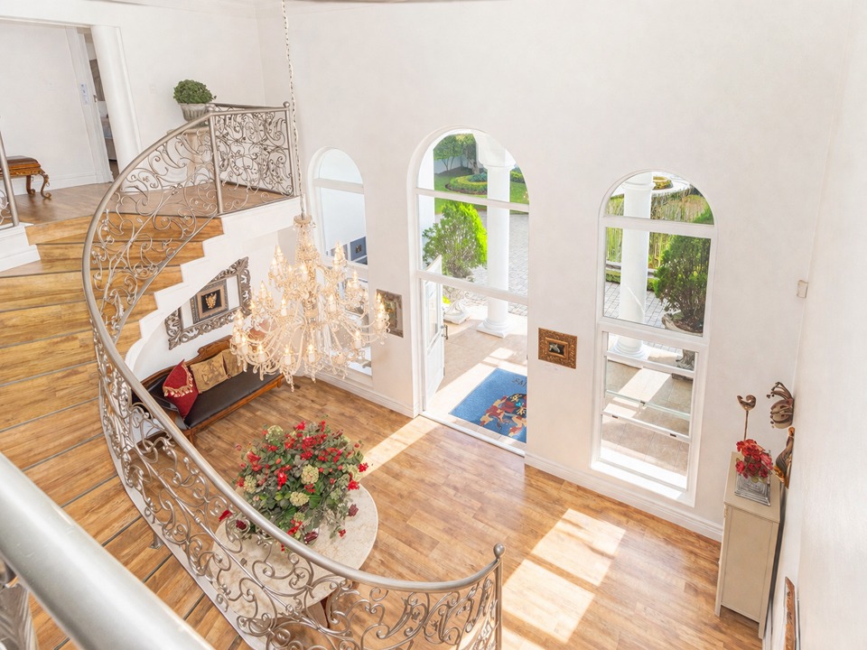 From the moment you approach the property, the striking white façade and castle-inspired architecture create an unforgettable first impression. Enter through the grand entrance hall, where beautiful chandeliers and a detailed staircase set the tone for the elegance that flows throughout the home.
