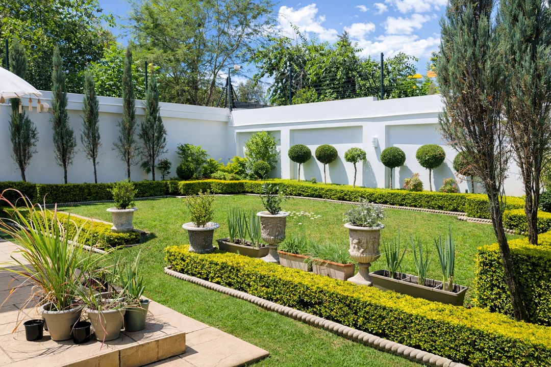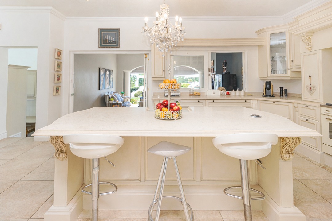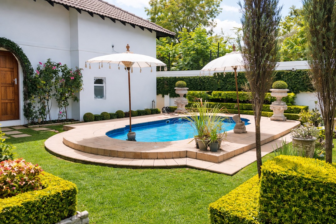 The home offers multiple living areas designed for both comfortable family living and stylish entertaining. The modern open-plan kitchen forms the heart of the home, featuring a five-plate gas stove, ample counter space and generous cupboard space — perfect for those who love cooking and entertaining. The kitchen flows effortlessly into the family TV lounge and entertainment areas, opening onto a beautifully landscaped garden with a sparkling pool, umbrellas and tranquil outdoor spaces.
