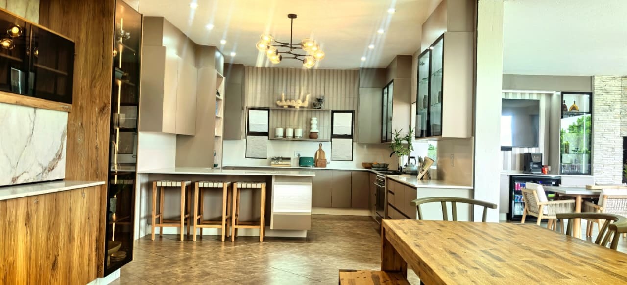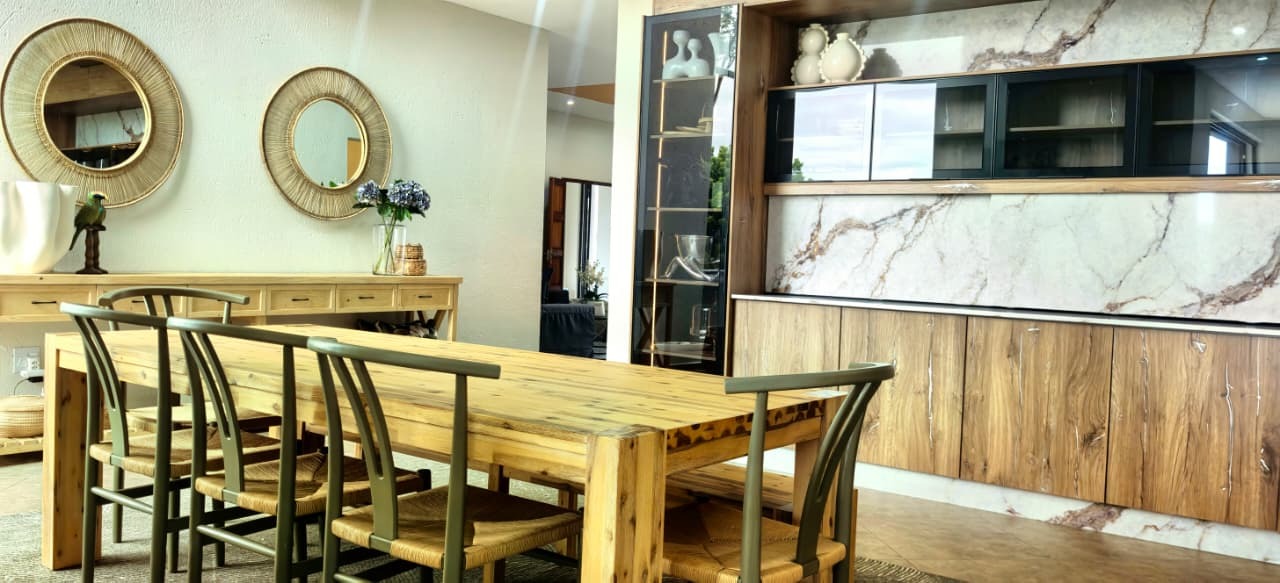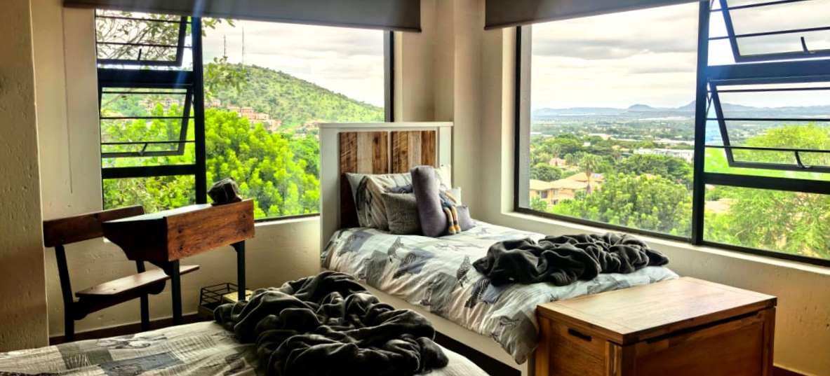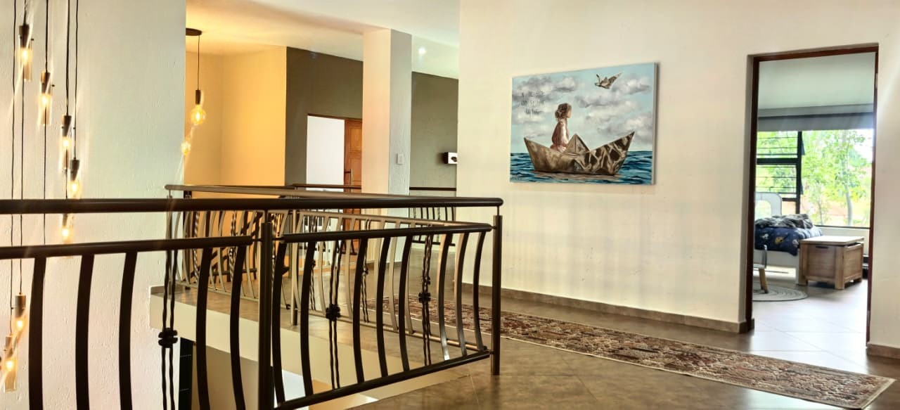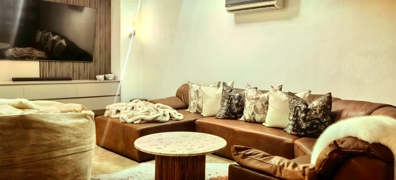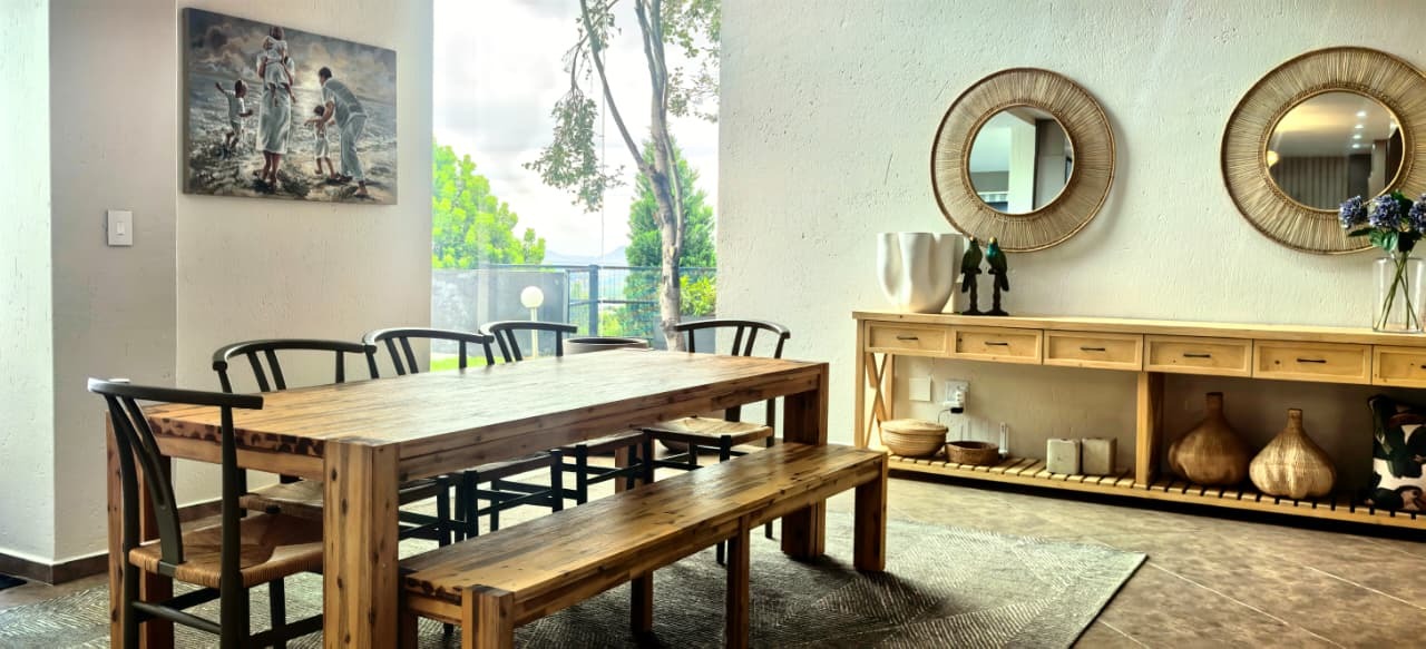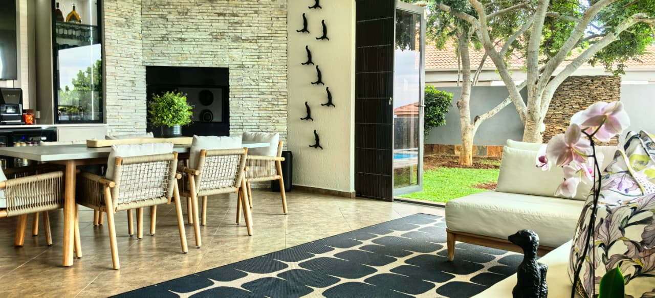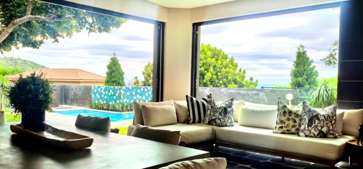 The home features two spacious lounges, a dedicated cinema room, and a patio dining area with a built-in gas braai. Stacker doors open seamlessly onto the pool area, creating the perfect indoor-outdoor flow for entertaining while enjoying panoramic views. A charming boma further enhances the outdoor experience, ideal for evenings around the fire.