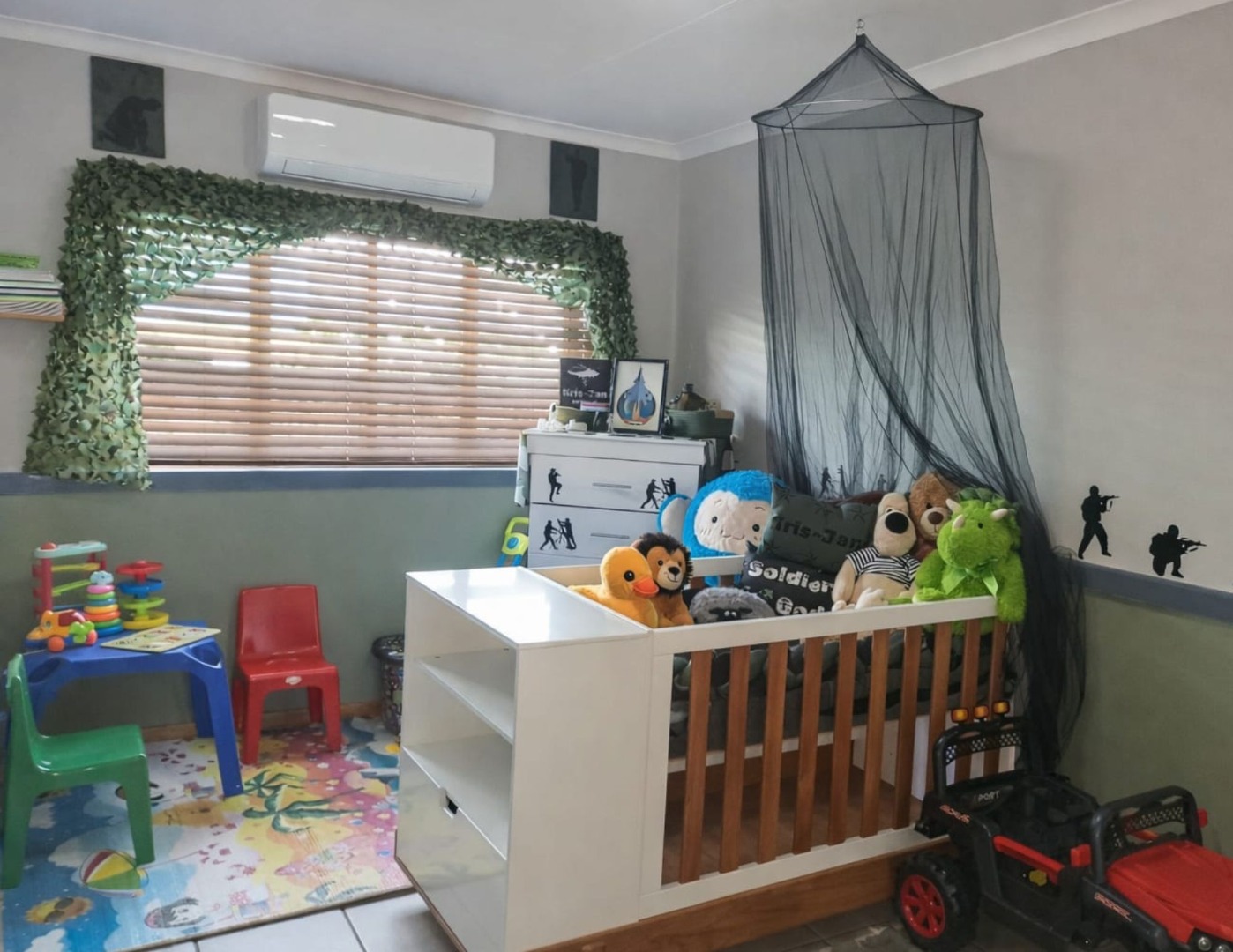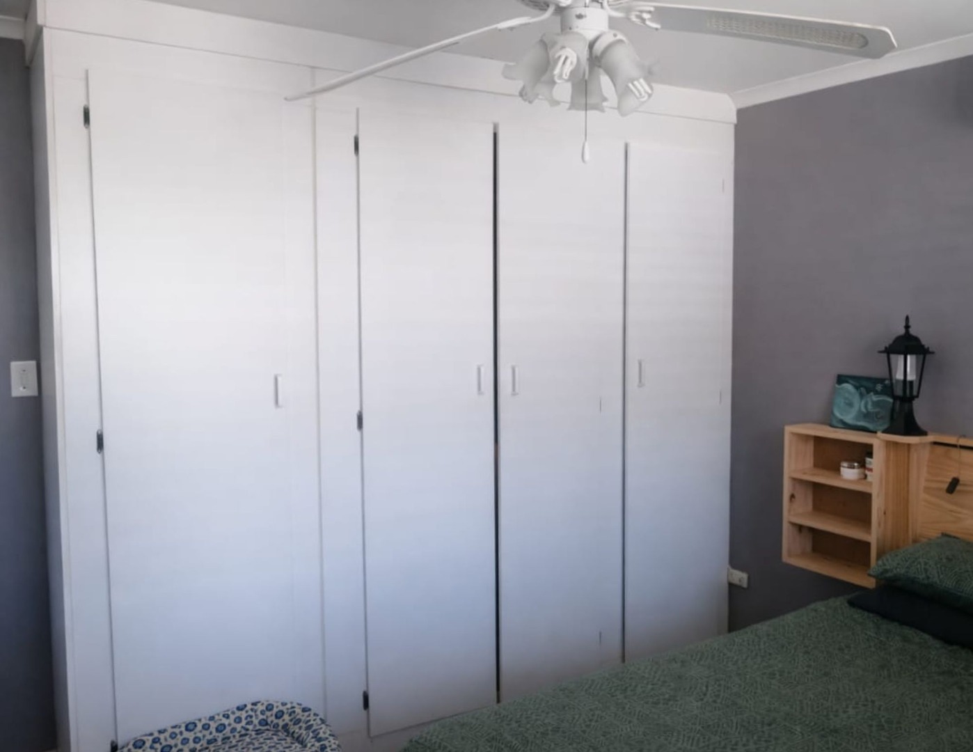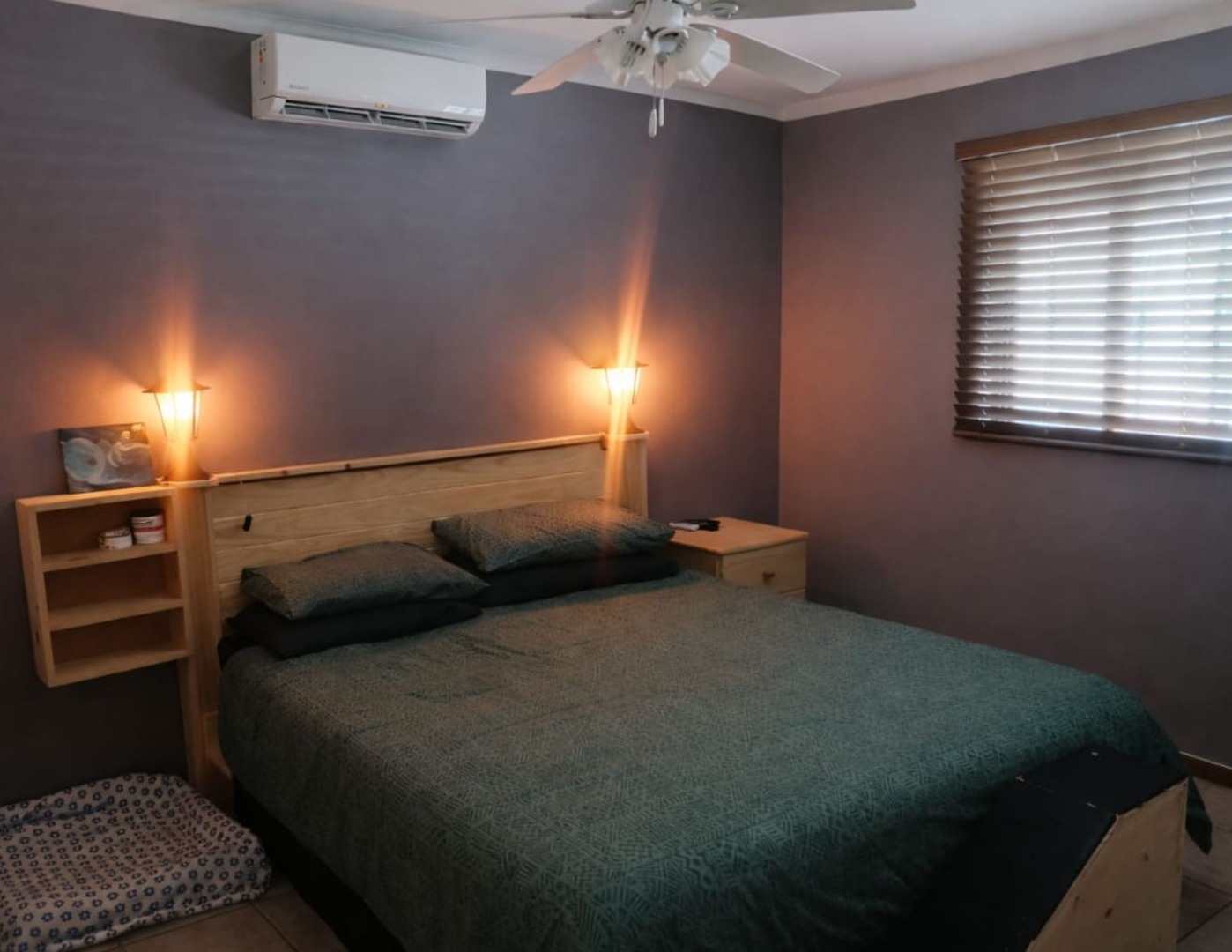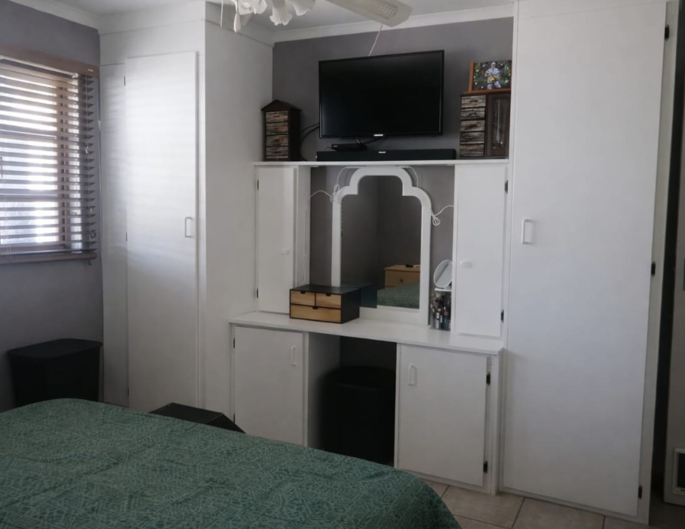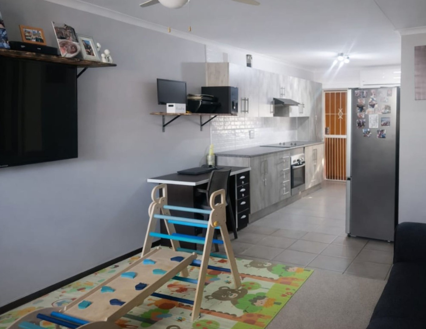 The home features a full bathroom equipped with a shower, bathtub, basin, and toilet. Both generously sized bedrooms come with built-in cupboards, ensuring plenty of storage space. Enjoy year-round comfort with three air conditioning units throughout the home.