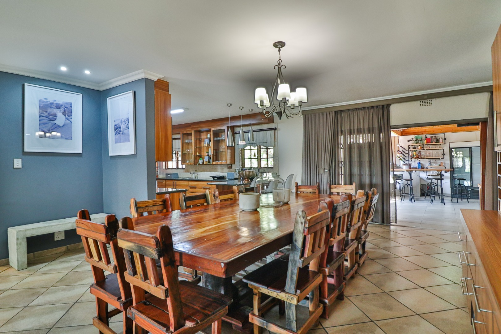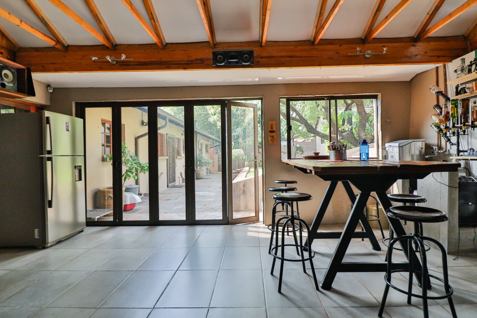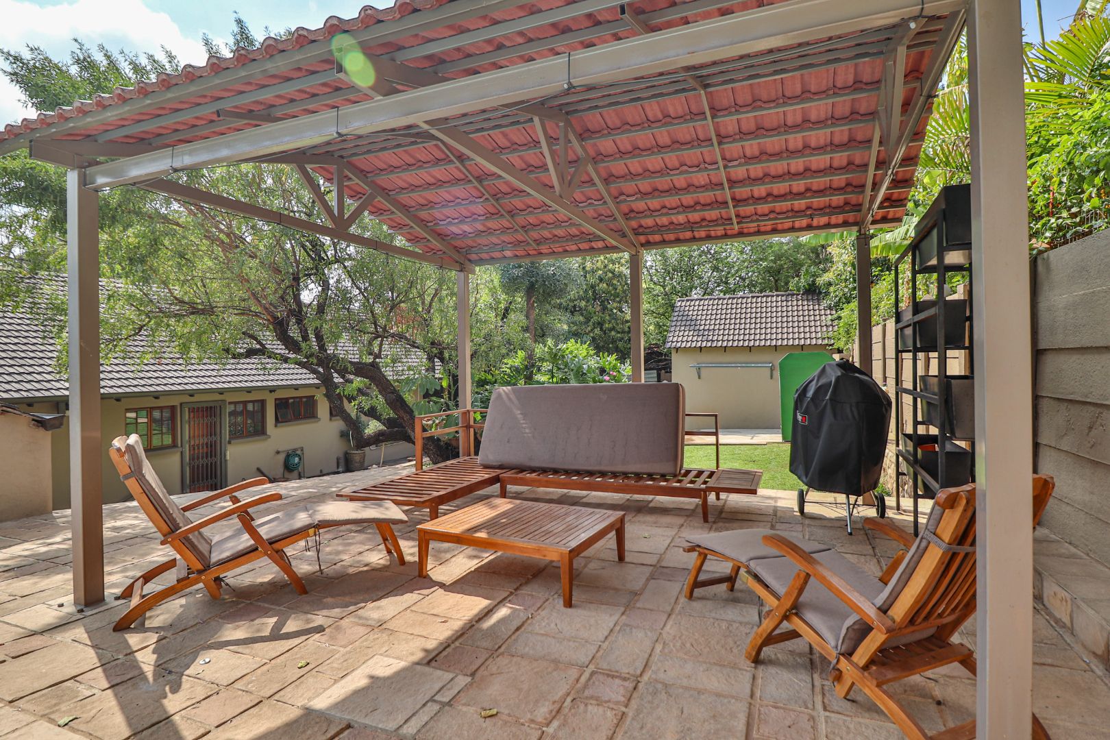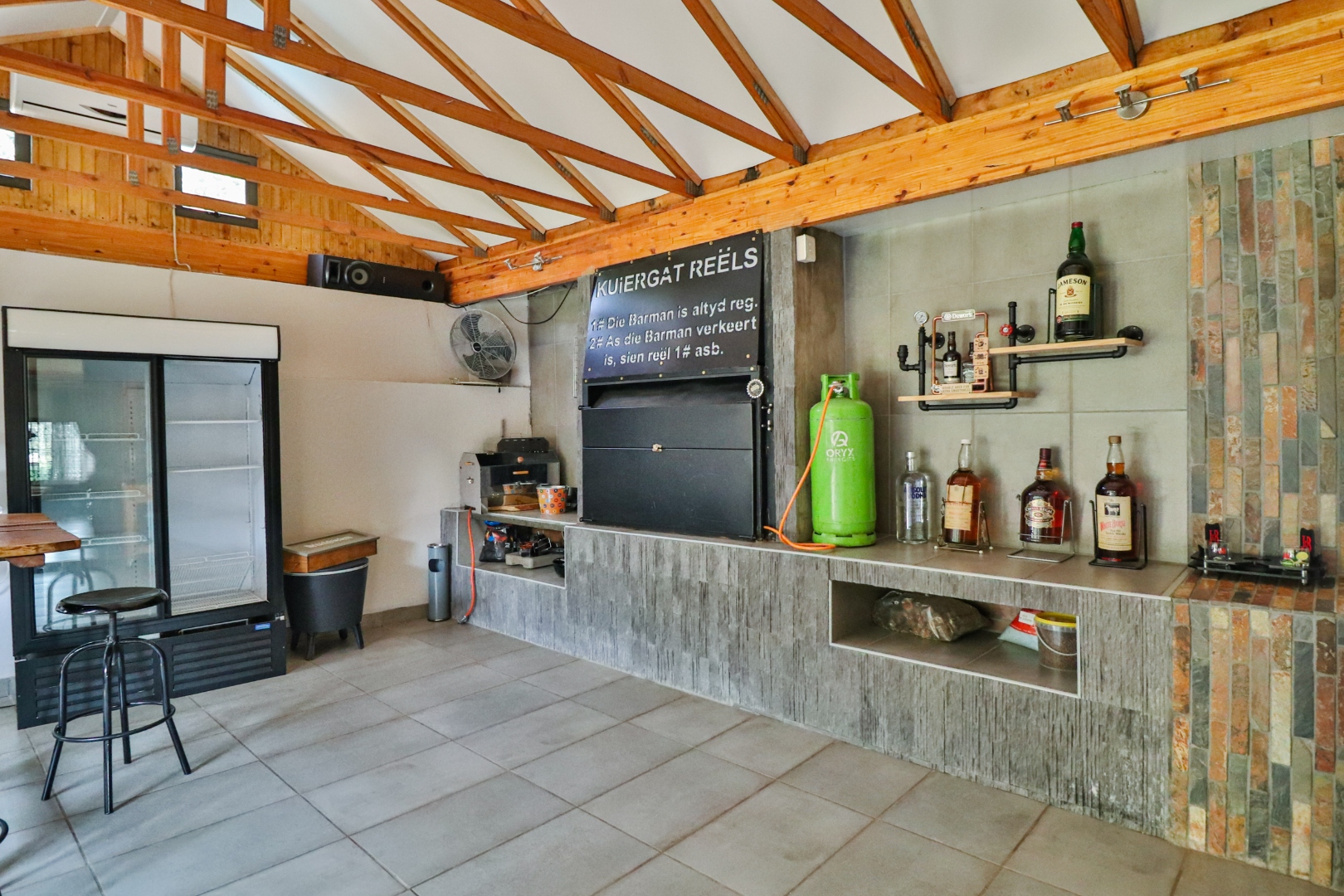 A stylish entertainment area with a built-in braai and bar,
