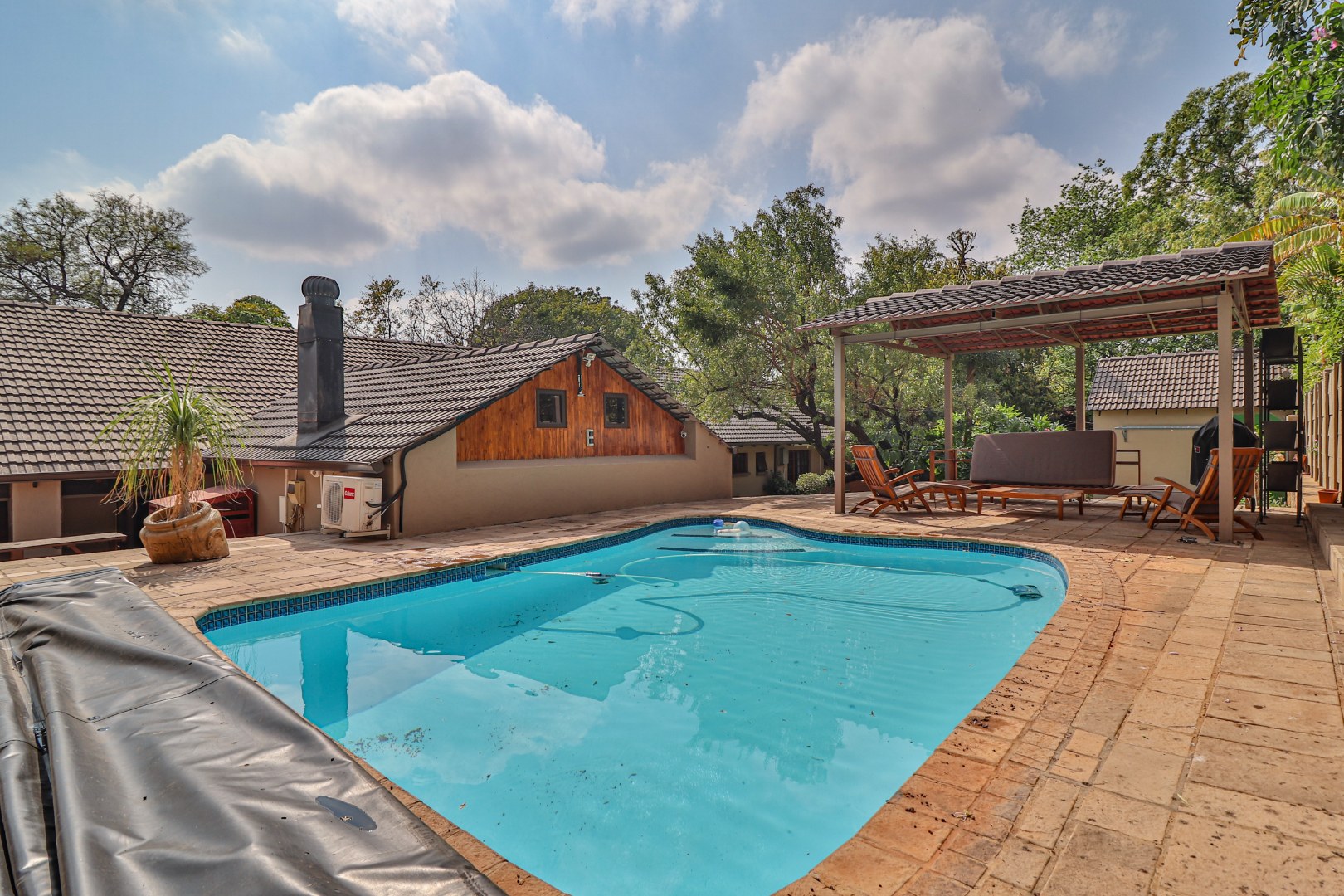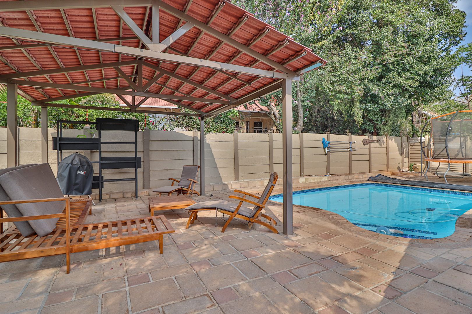 A sparkling swimming pool with an additional entertainment space,