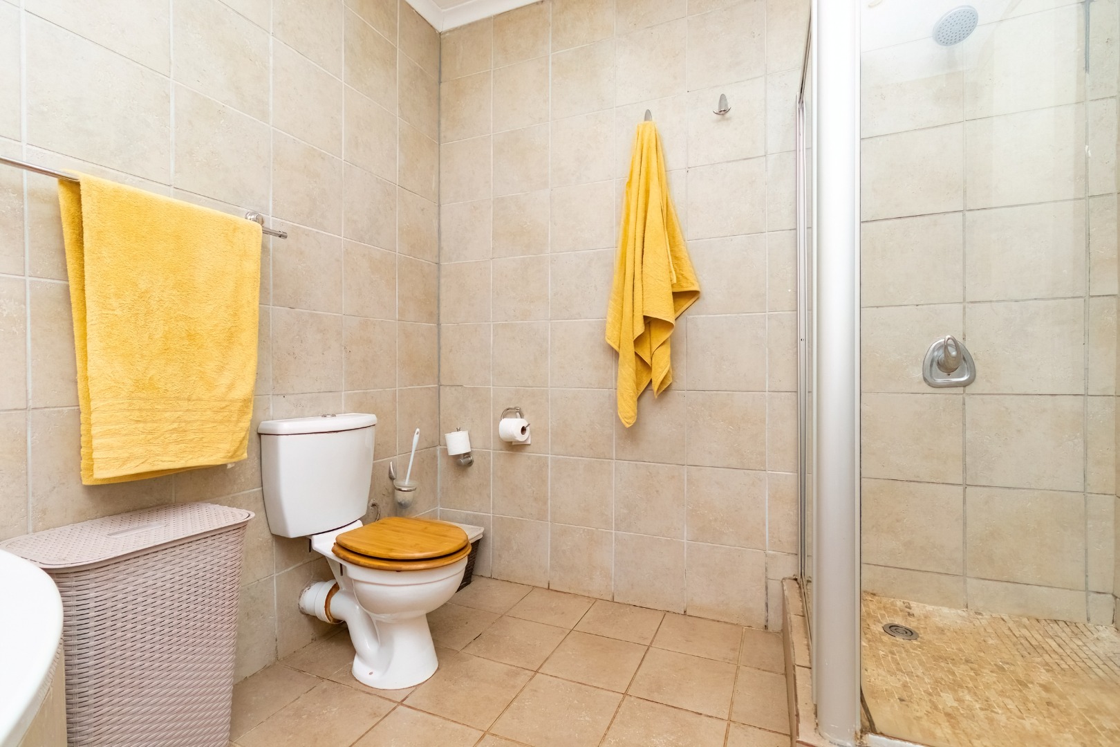 The home boasts three well-sized bedrooms and two bathrooms. The main bedroom is a true retreat with a walk-in closet and a luxurious en-suite bathroom featuring both a shower and a corner bathtub.
