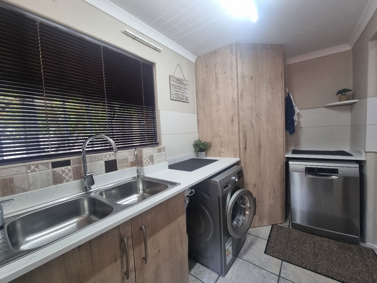 The modern kitchen is designed for convenience, with space for a dishwasher, washing machine, and tumble dryer, along with an under-counter water filtration system.