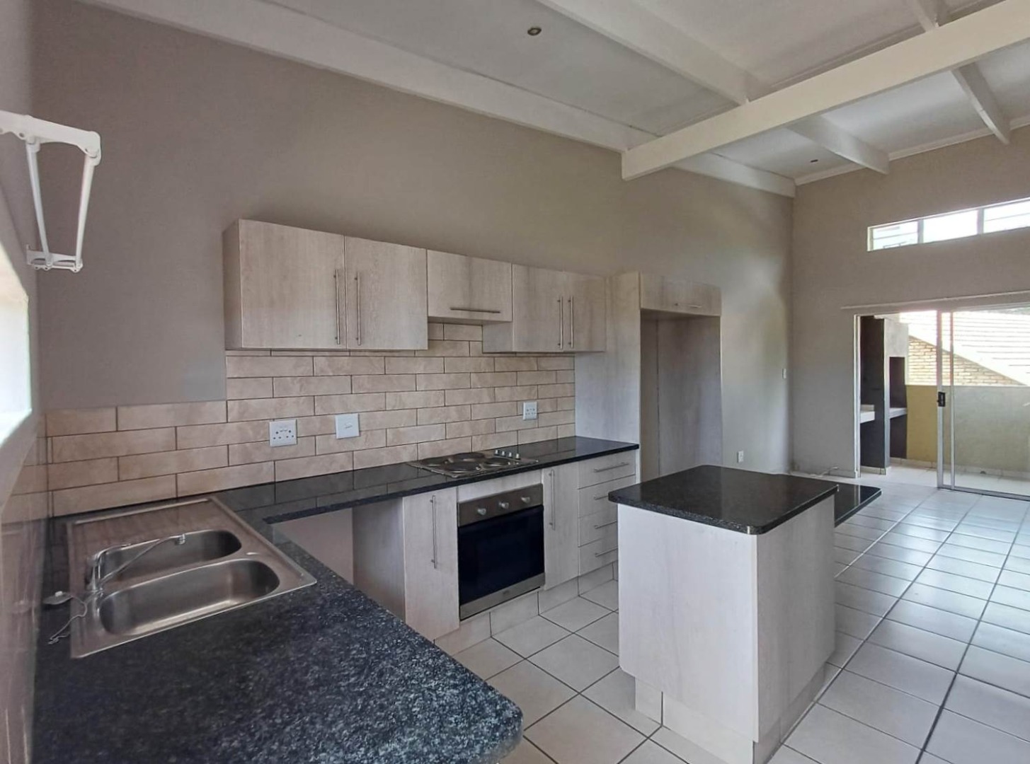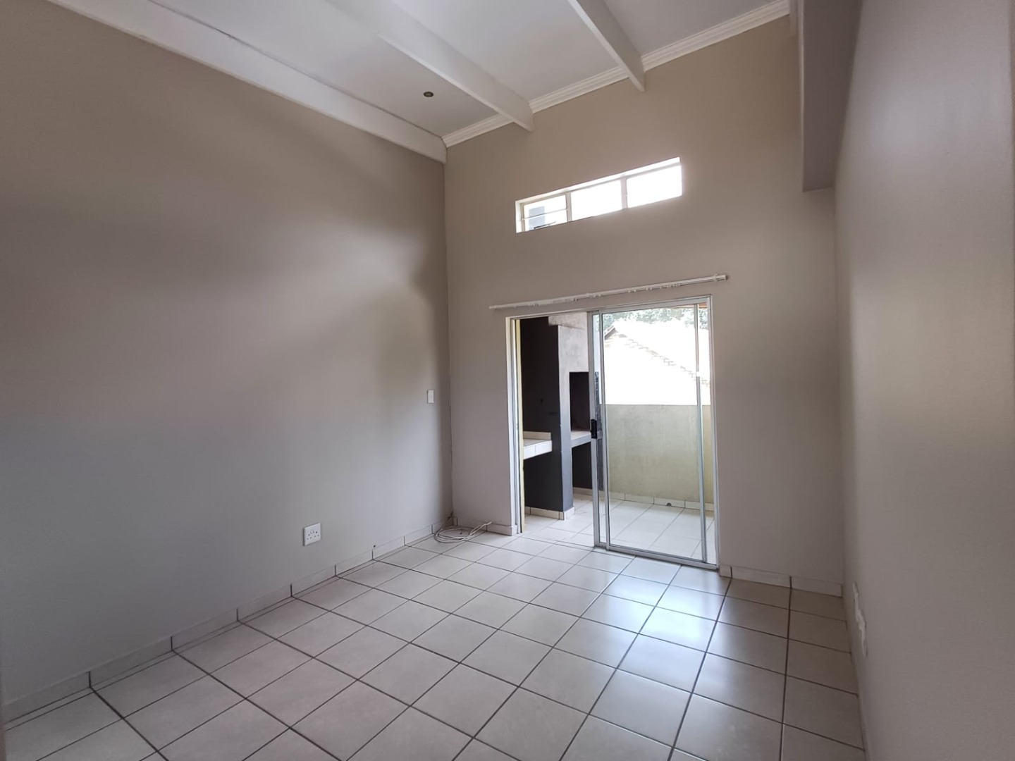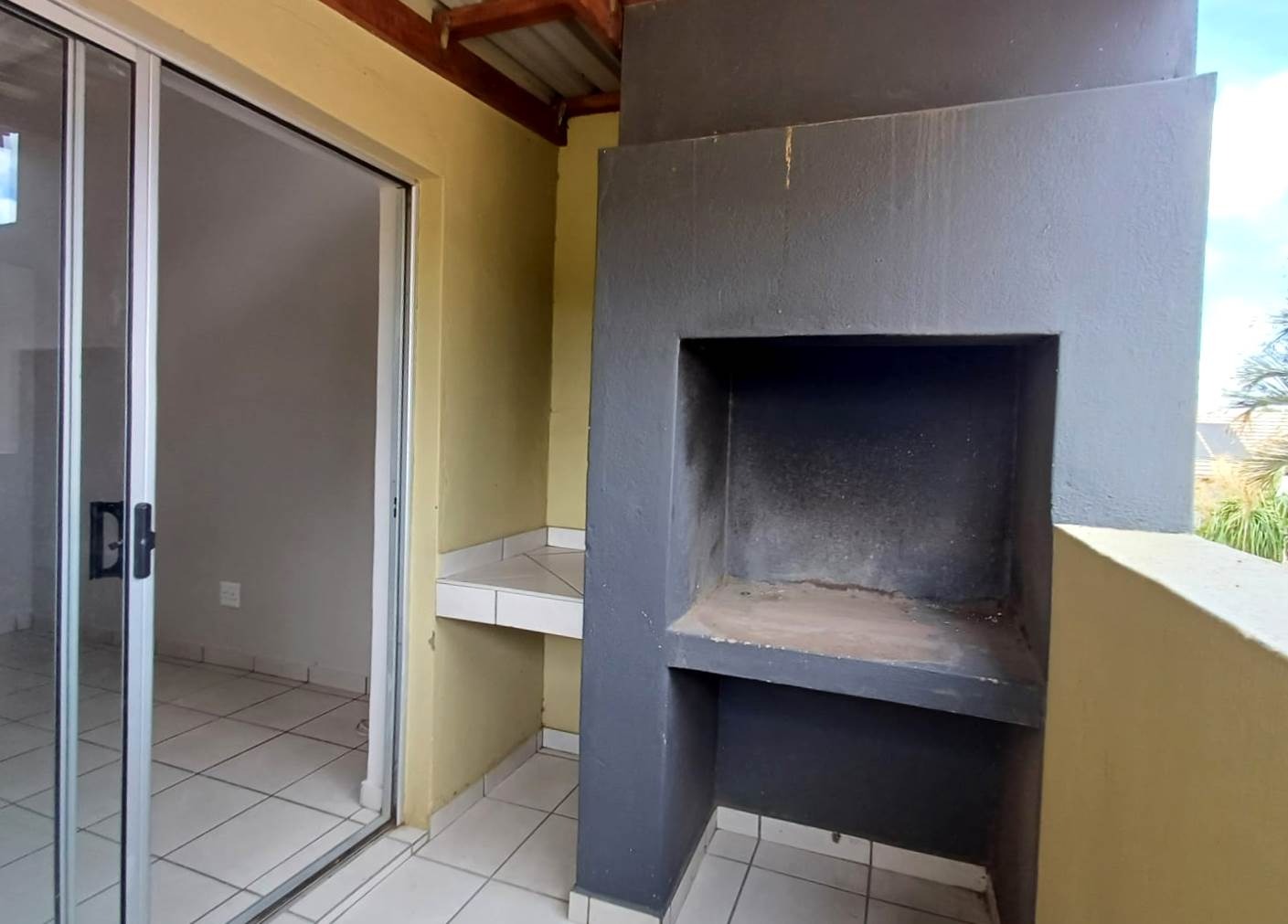 The unit offers an open-plan kitchen with built-in cupboards that flows into a comfortable lounge area, leading to a private balcony with a built-in braai, perfect for relaxing or entertaining.
