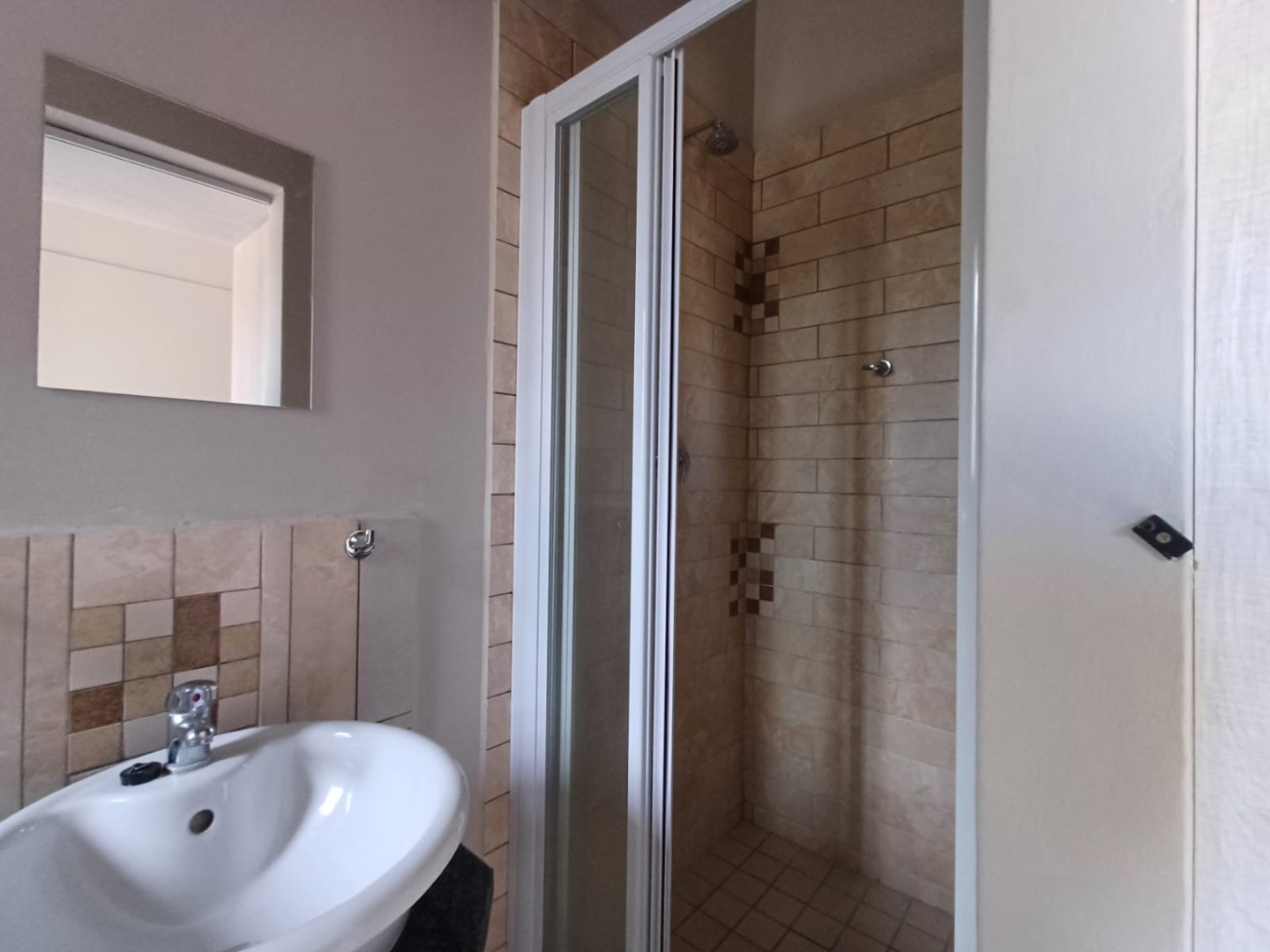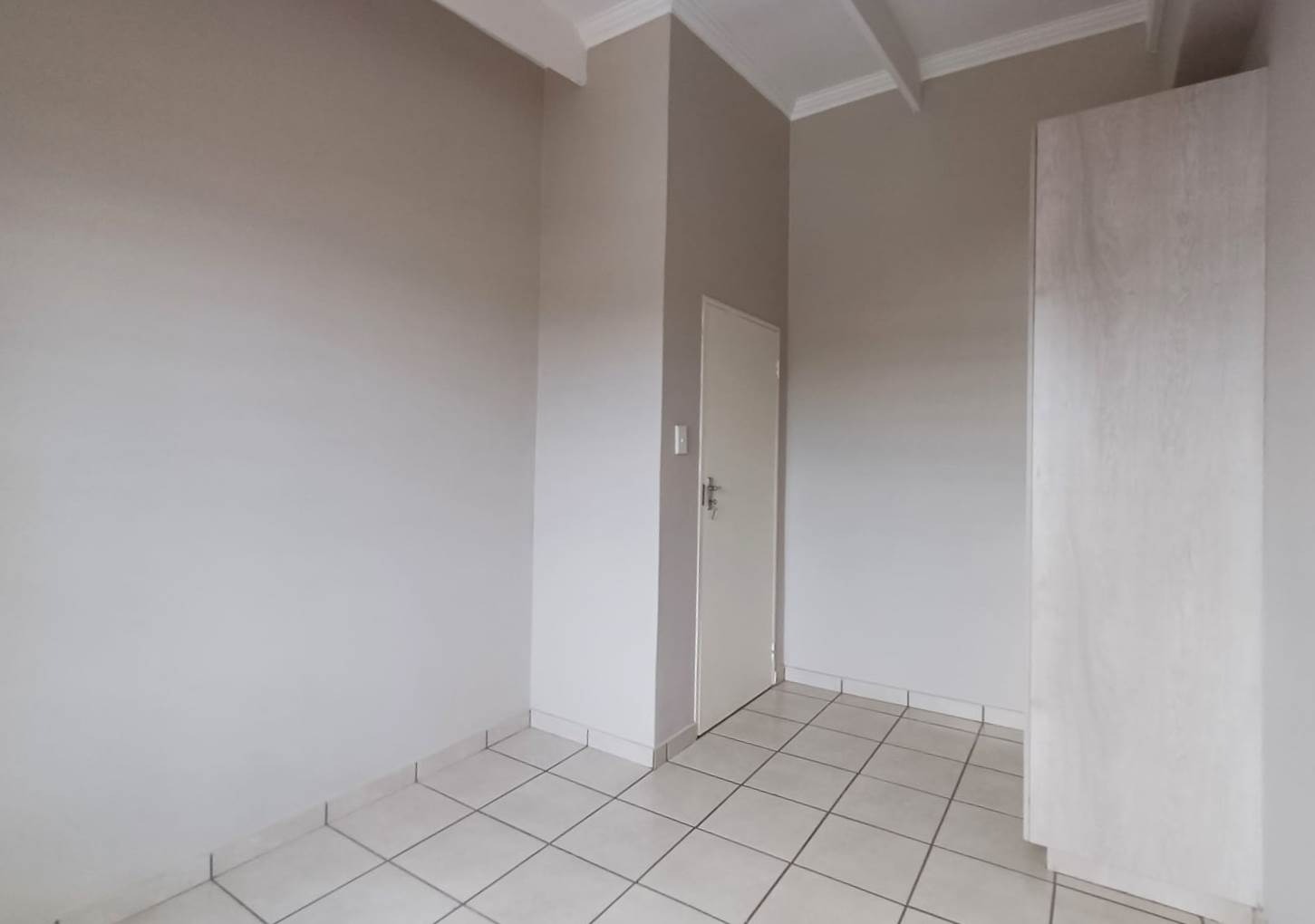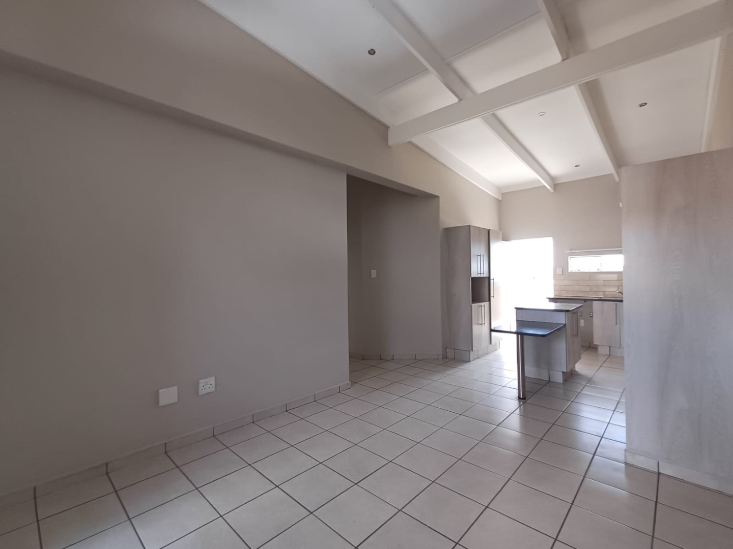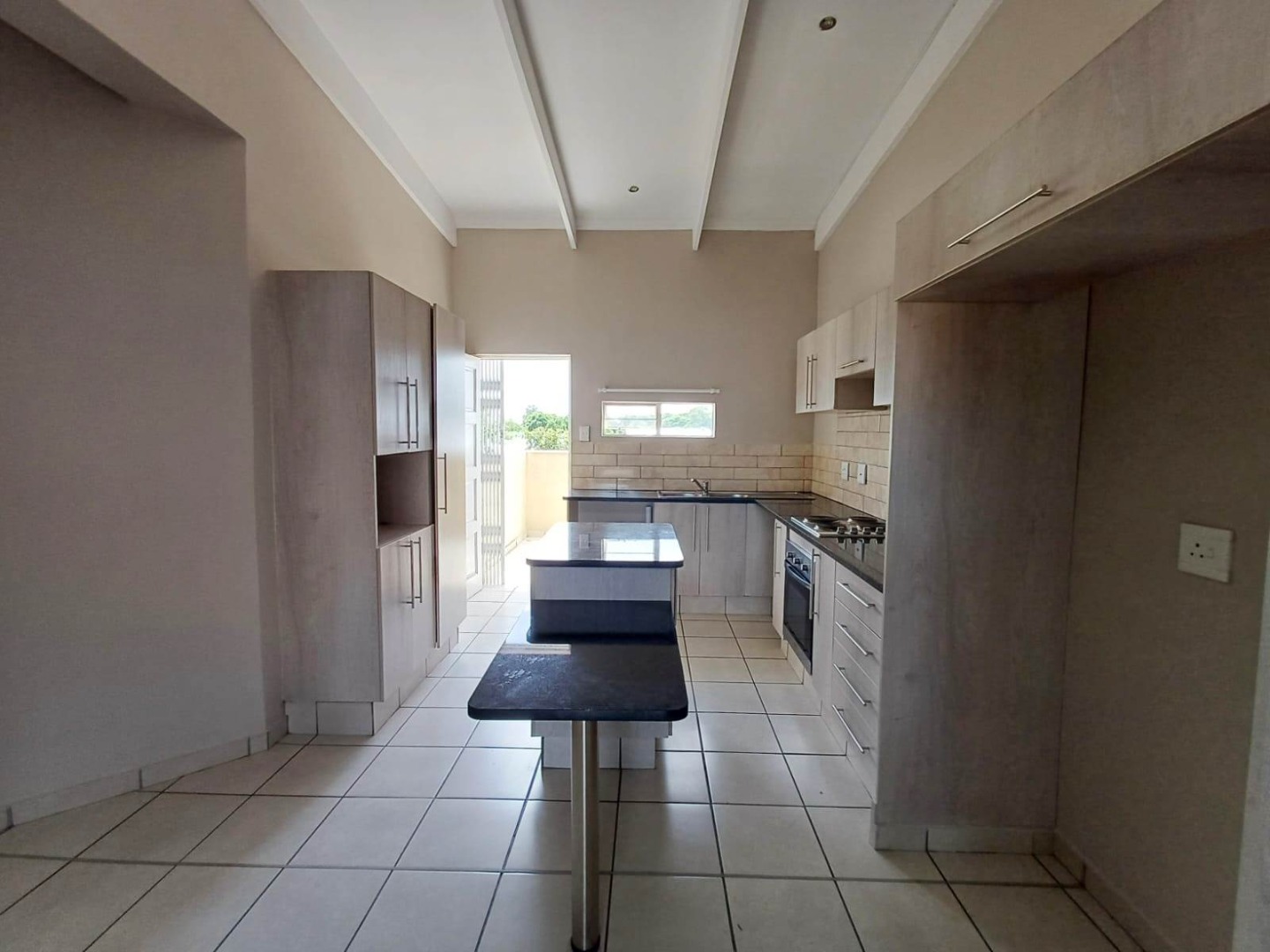 The unit offers an open-plan kitchen with built-in cupboards that flows into a comfortable lounge area, leading to a private balcony with a built-in braai, perfect for relaxing or entertaining.