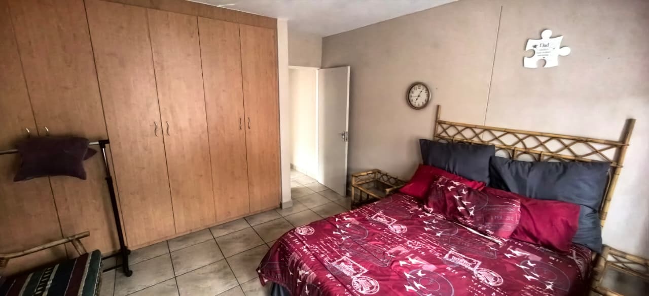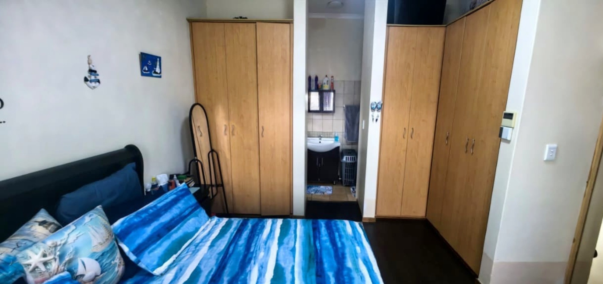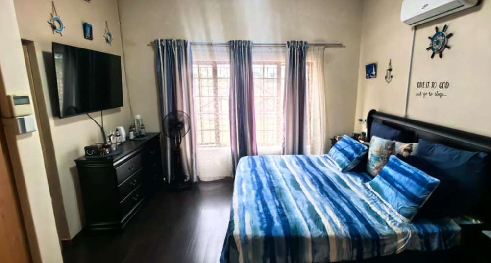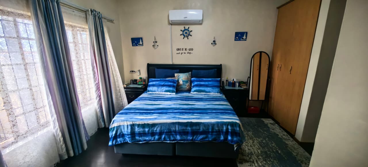 Main bedroom upstairs, air-conditioned with ample cupboard space and en-suite bathroom. . .