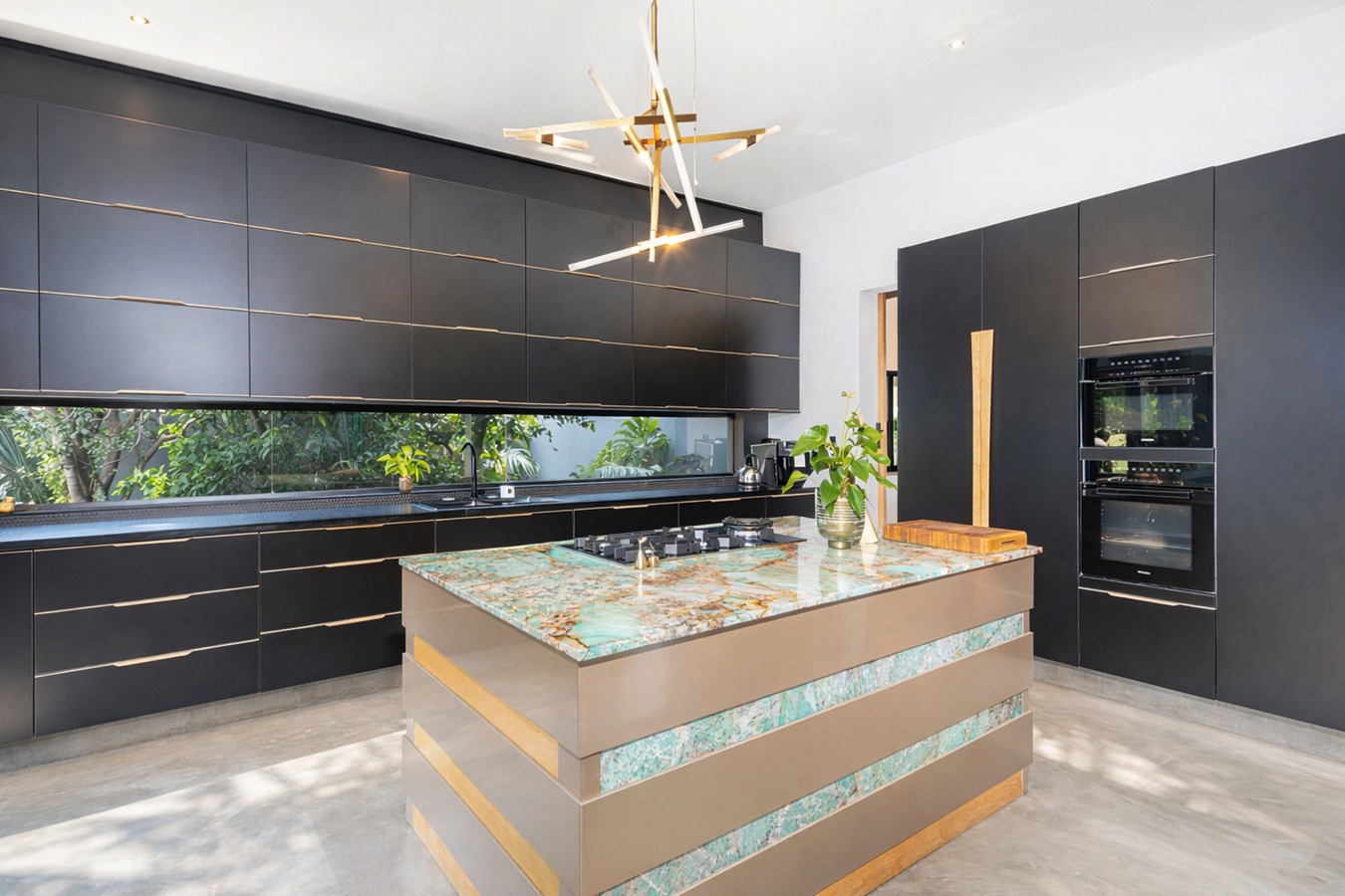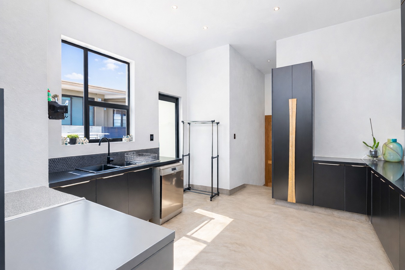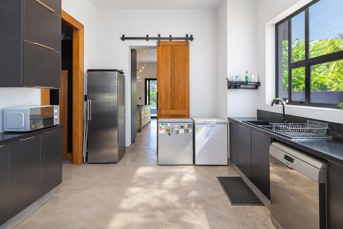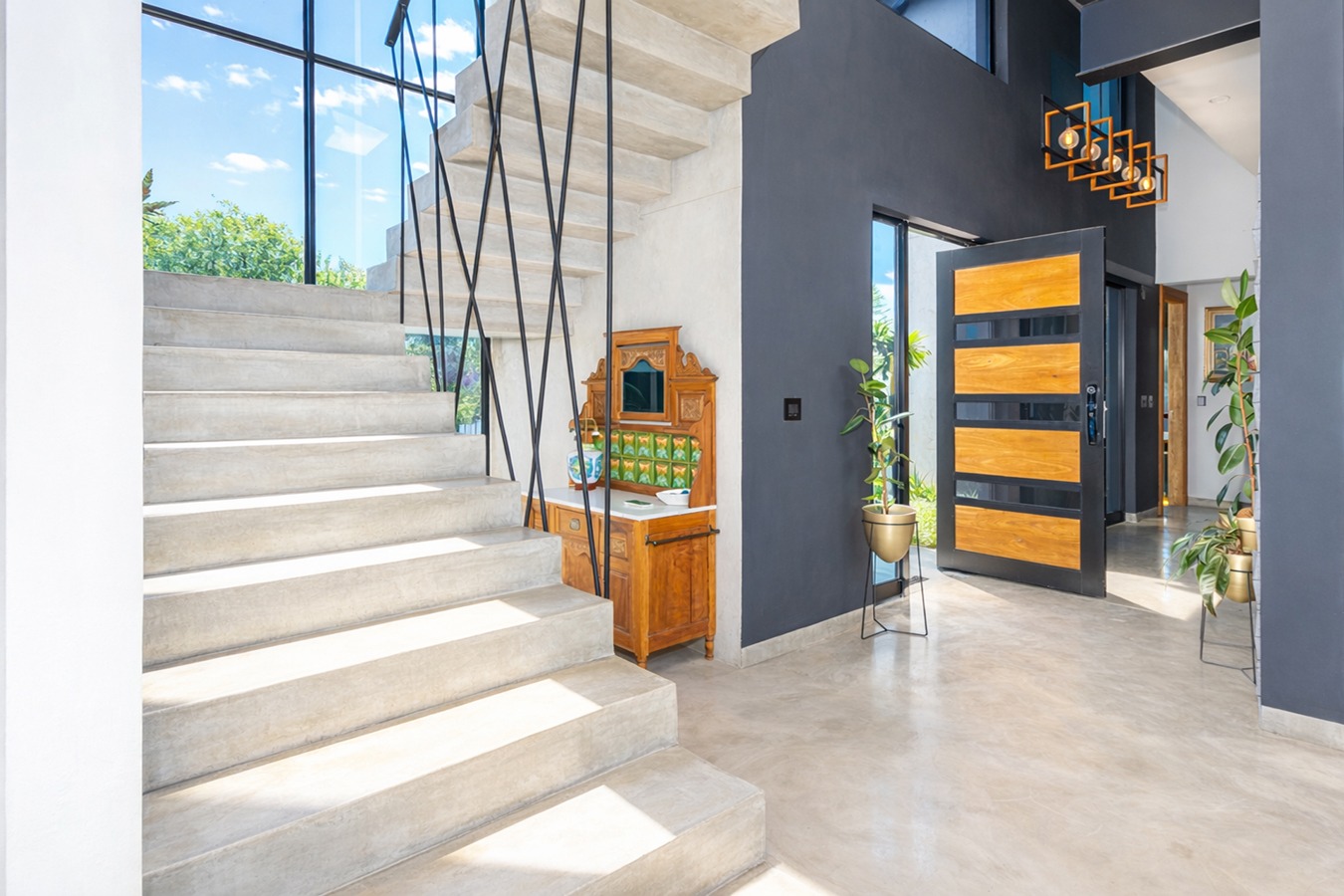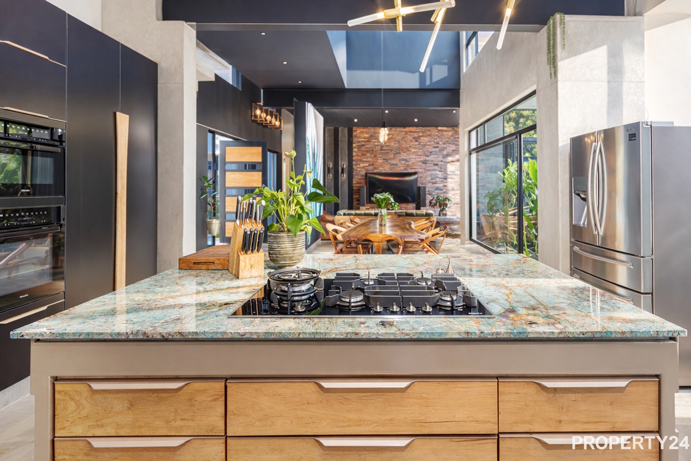 The home welcomes you with expansive open-plan living areas, perfect for both relaxed family life and stylish entertaining. The modern kitchen is a true centerpiece, featuring a custom-designed island, striking granite and wood finishes and premium appliances including a Miele stove, oven and microwave. A grand staircase and oversized front door add to the impressive entrance statement.